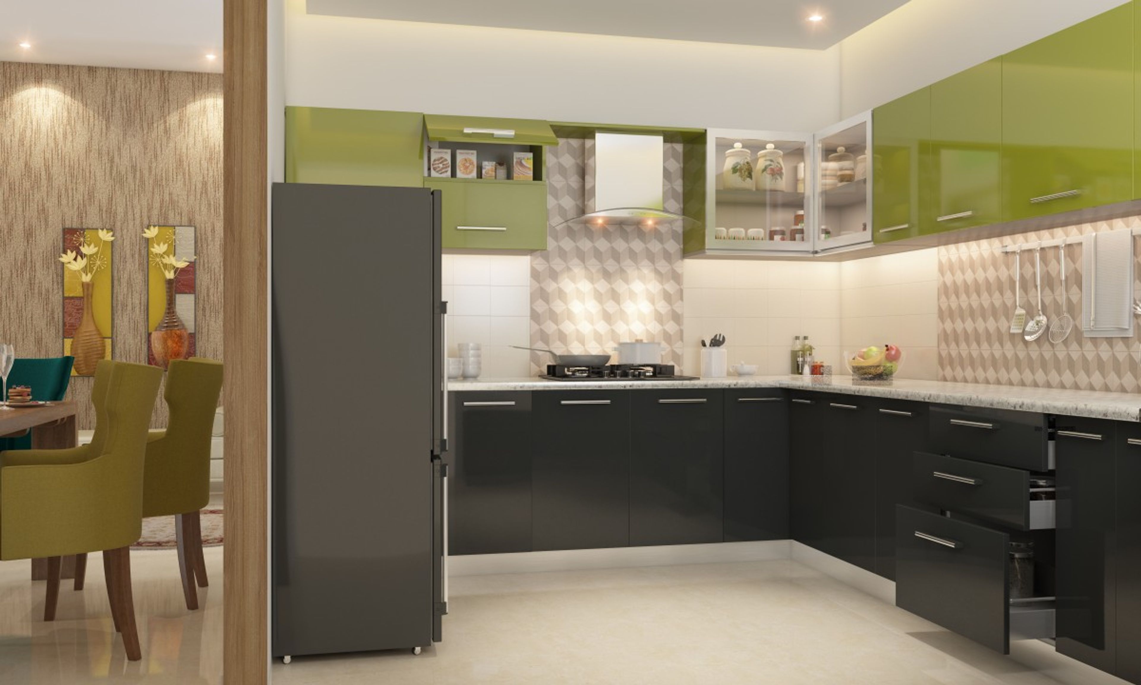 An unconventional mix of green and black cabinets give this kitchen a unique edge.   Glossy surfaces cast a resplendent glow, while a patterned backsplash breaks the monotony of the solid colors. The lift-up cabinets keep frequently used cooking ingredients within easy reach. See-through doors provide the perfect opportunity to show off prized cutlery.   Outfitted with modern appliances like hob, chimney and mixie Features wall hanging spatula rack