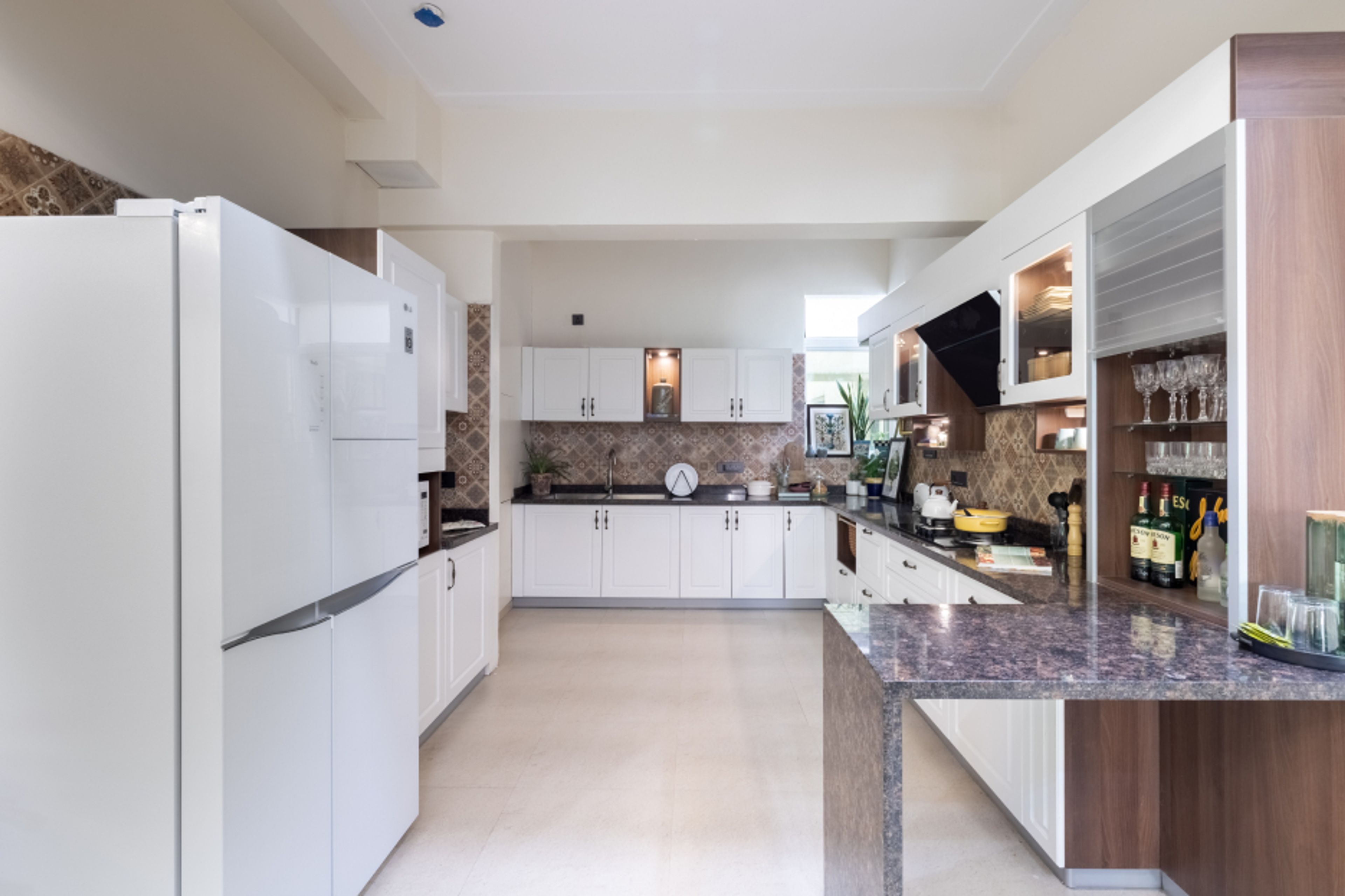 • Storage Features: Spacious cabinets with drawers, a wicker basket, wall units with glass shutters, open shelves, and a bar unit