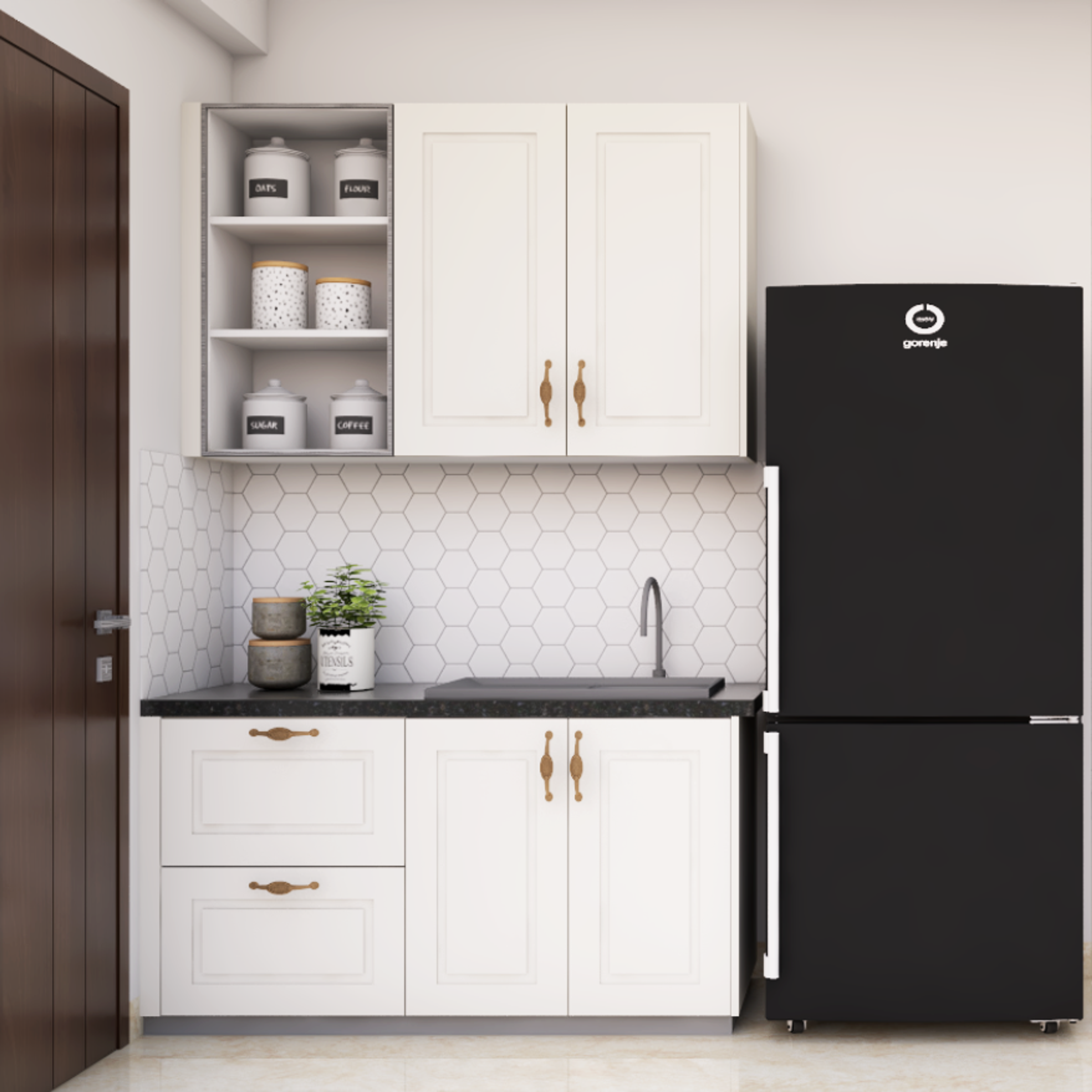 "This classic kitchen design with profile shutters and gold handles is reminiscent of the 60s and takes you on a nostalgic trip down memory lane with its décor. The white shade makes the compact space feel bigger. The black countertop adds contrast and spells elegance with elan. "