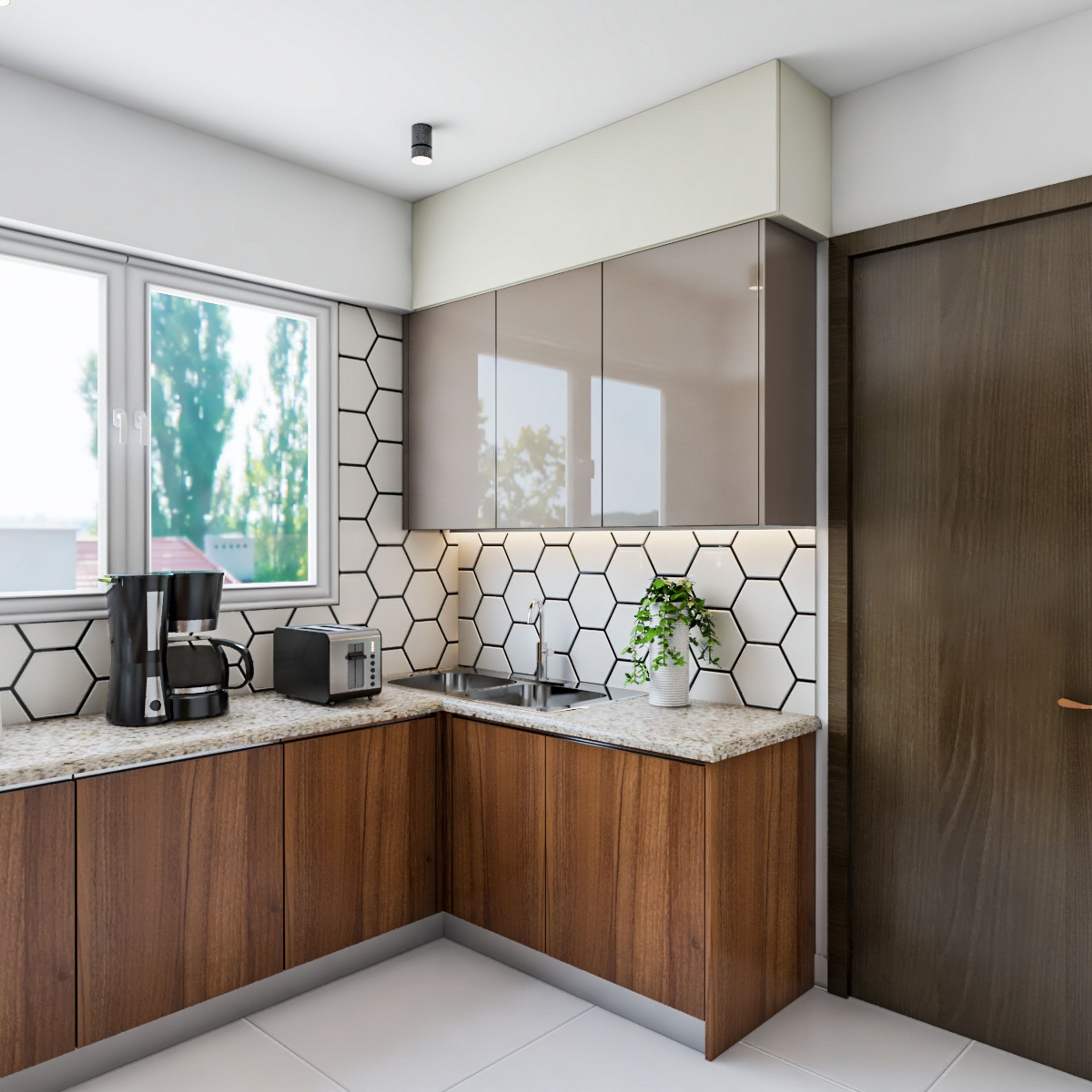 White and wood kitchens never go out of style and this kitchen is no exception. The walnut bronze laminates used for the lower cabinets and the capuccino acrylic for the upper cabinets give a neat finish with honeycomb-patterned dado tiles. This U-shaped kitchen also has proper functionality along with a beautiful white worktop and several open ledges for convenient storage. Strip lights on the bottom of the upper cabinets also highlight the worktop.