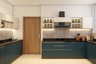 This L-shaped blue kitchen looks convenient with the right placement of the different utilities. The black and white checkerboard dado design stands out and gives a timeless look to the space. The modular look of the cabinets gives a neat appearance with medium-sized steel handles and a glossy look.