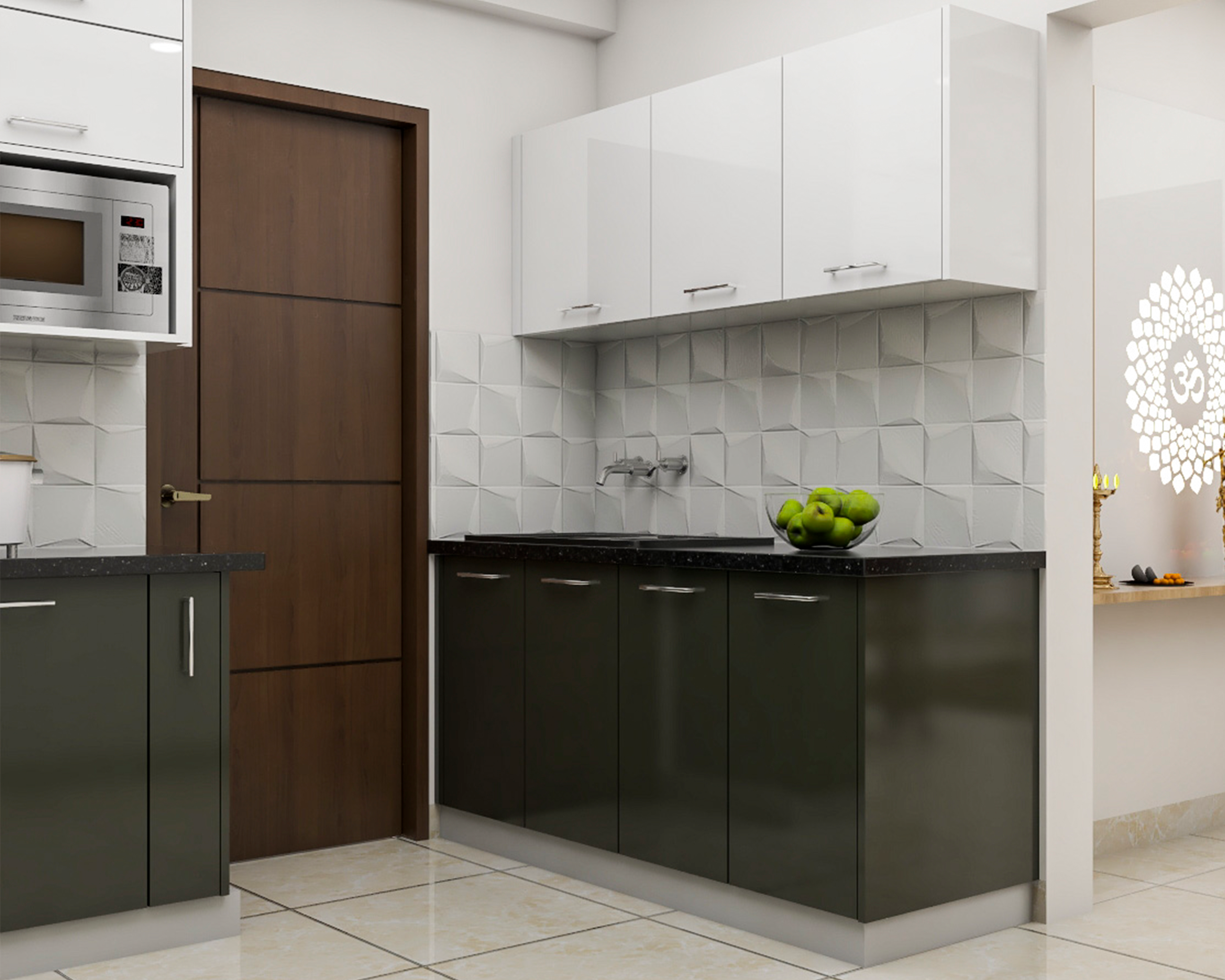 This spacious modular kitchen, L-shape kitchen design is styled with contemporary decor. The black and white kitchen looks timeless and elegant. The simple neutral palette gives a balanced look. The L-shaped kitchen maximises storage. The white dado tile gives a 3D effect and looks unique and bold. This beautiful design is easy to maintain.