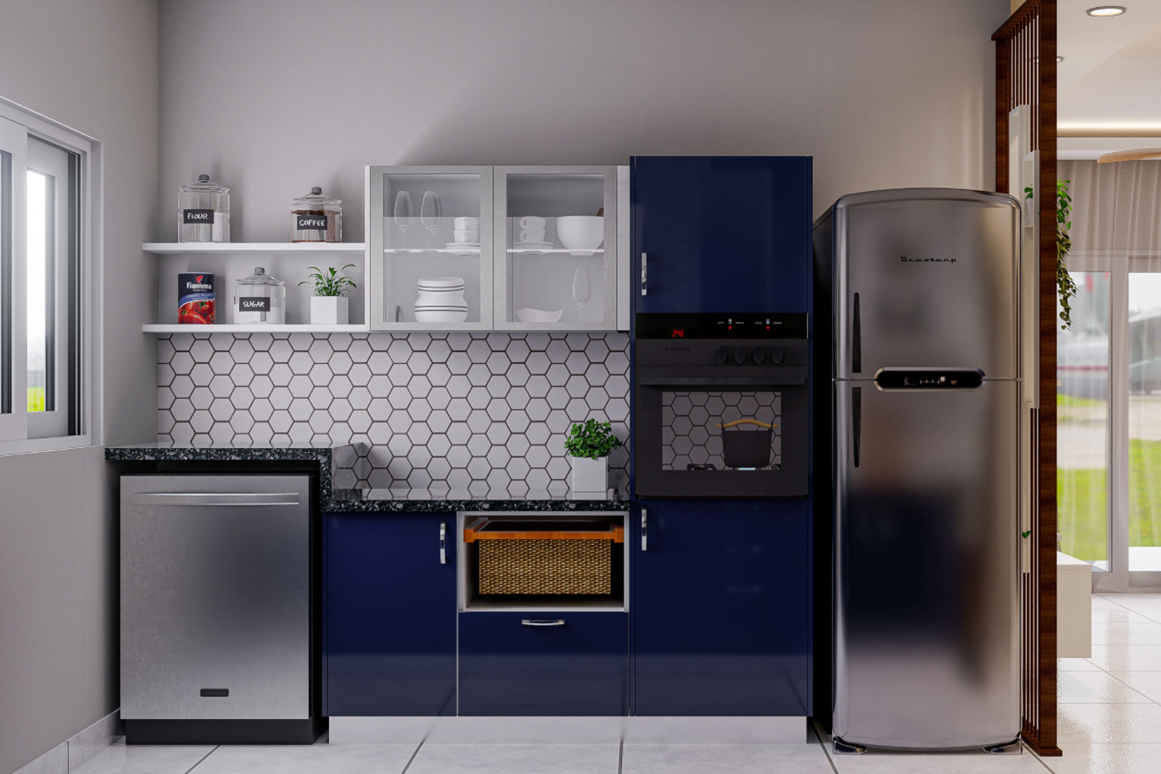 The beauty of dark blue cabinets is complemented by the white honeycomb patterned dado tiles giving a timeless look to this kitchen. The black countertop in a step-up pattern is one-of-a-kind which makes your kitchen stand out from the rest. The wicker basket for in-built storage and in-built appliances further make this kitchen highly efficient.