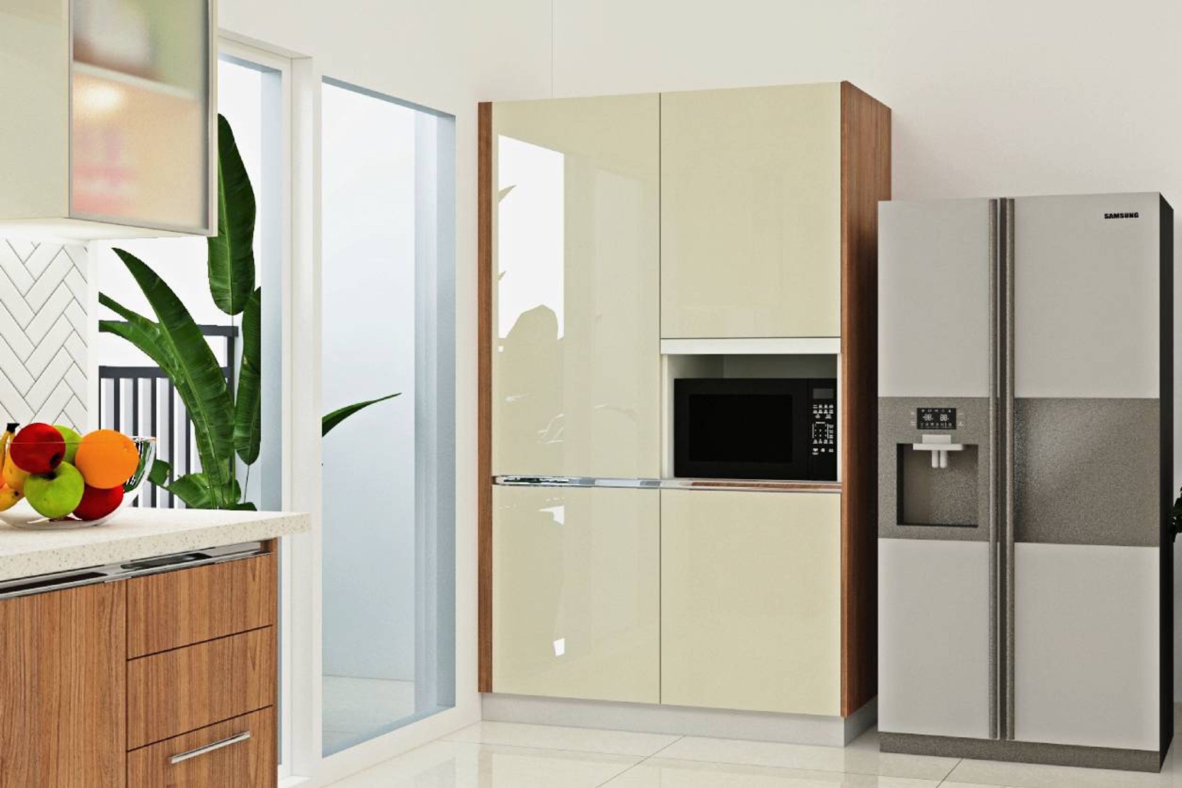 The combination of wooden textured lower cabinets with the off-white upper cabinets does wonders for this kitchen with a patterned white dado. The pure white countertop also gives a seamless and refreshing look to the space. With enough storage and in-built appliances like a microwave, fridge, and chimney, this kitchen is highly efficient and functional. The open wooden units and the profile handles for the lower cabinets also add a touch of class to this kitchen.