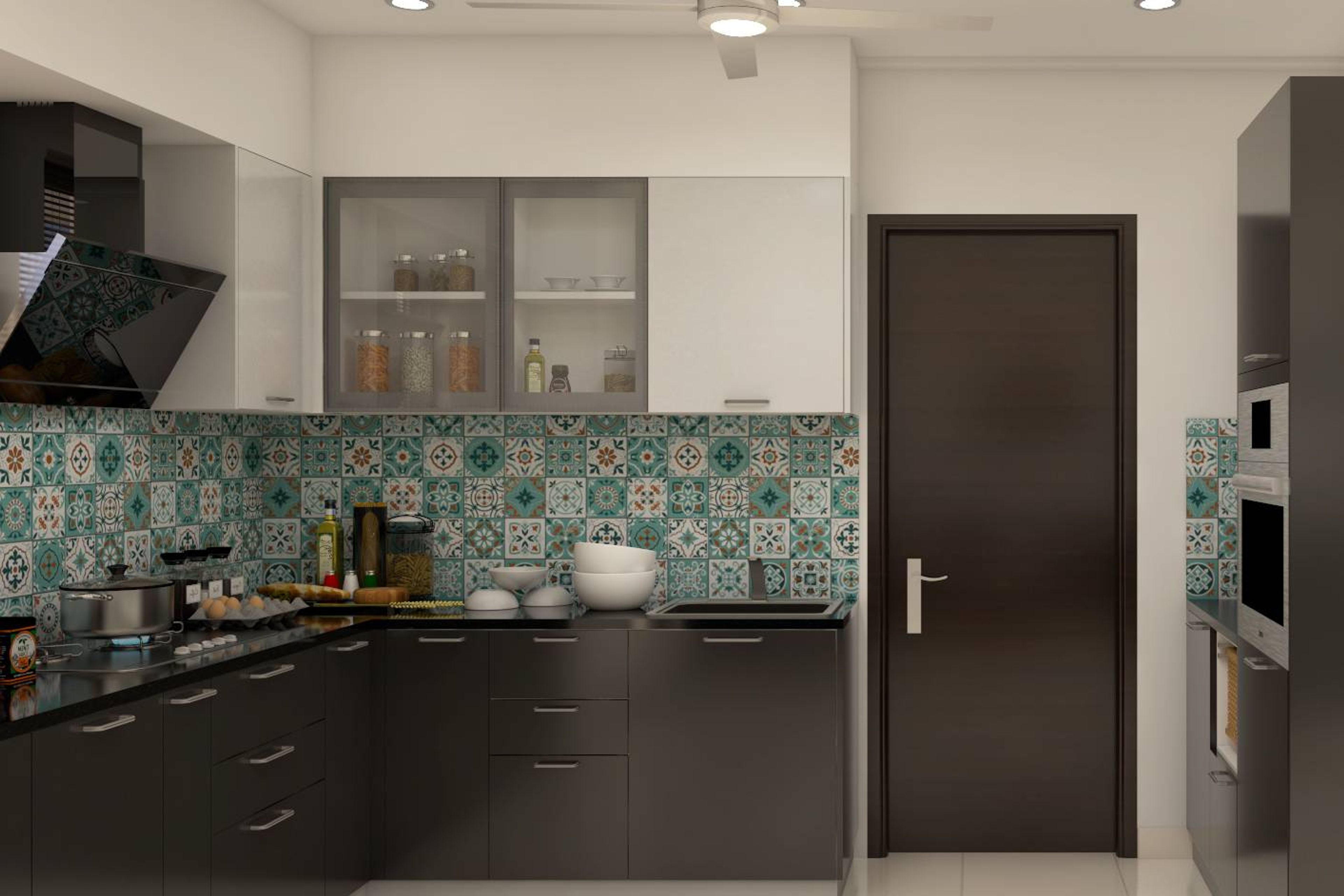Experience bliss in these gorgeous and spacious kitchen interiors, complete with all electronic appliances, including the chimney, fridge and oven. The L-shaped contemporary kitchen design features ample storage with grey lower and white upper cabinets for a beautiful contrast. The blue-patterned dado tiles bewitch along with the sleek black countertop.