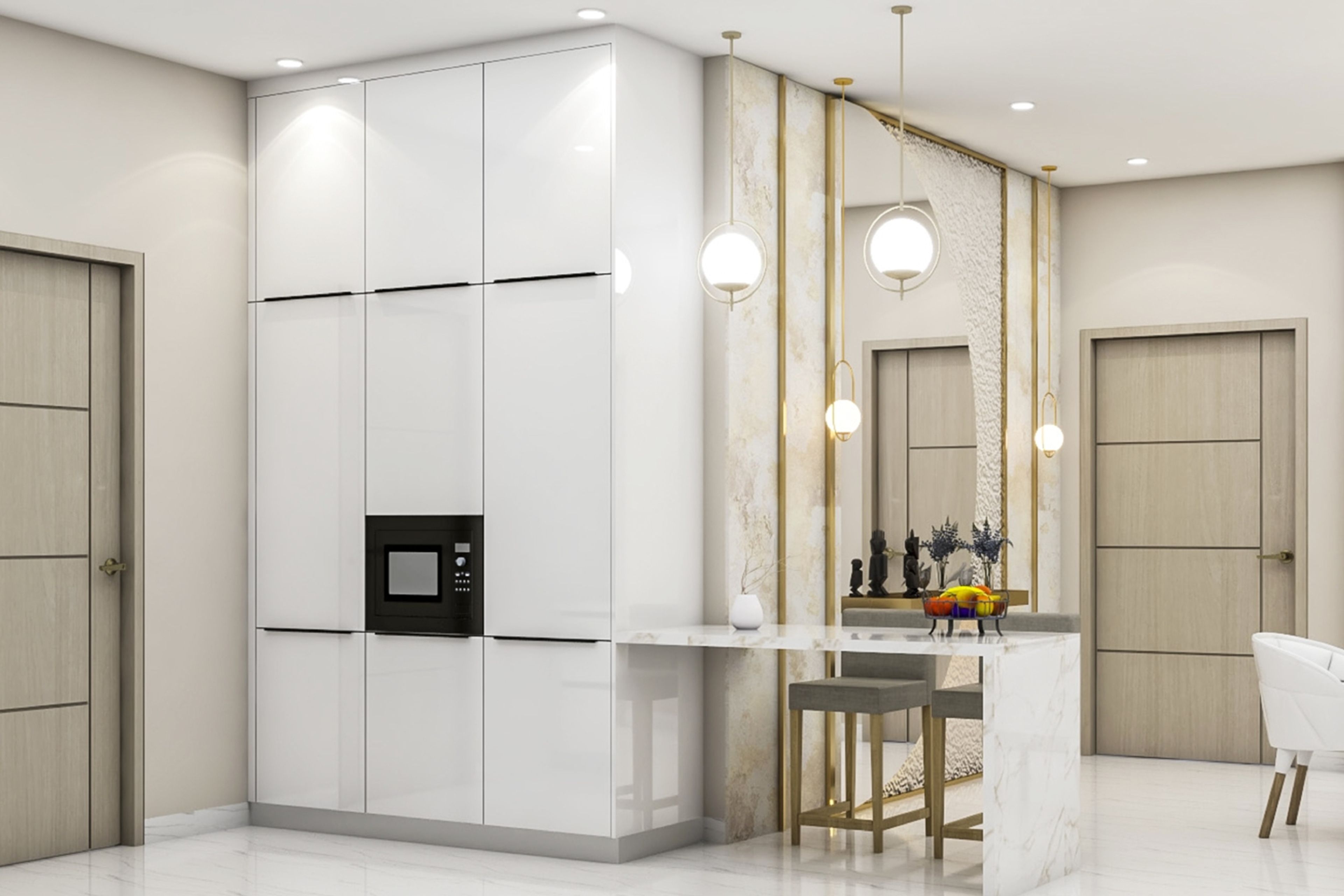 You can estimate the cost of Contemporary Modular Open Kitchen Design In Frosty White With Frosted Shutters easily using the Livspace Modular Kitchen Cost Calculator. Enter your kitchen size, materials, and finish preferences to receive a personalized price estimate instantly.