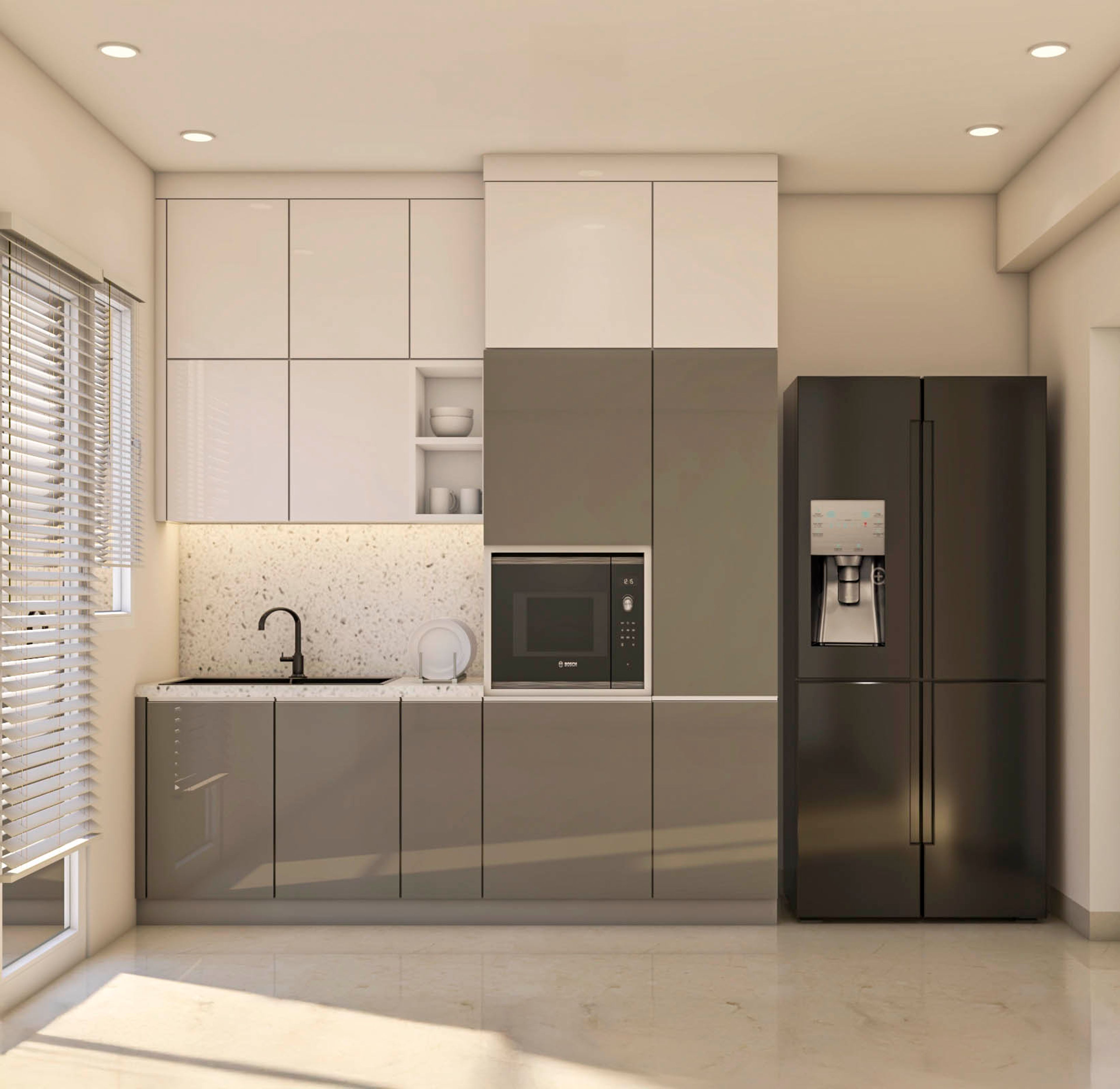 - This layout uses a continuous run of tall, handleless cabinets above and below, maximizing vertical and horizontal storage.