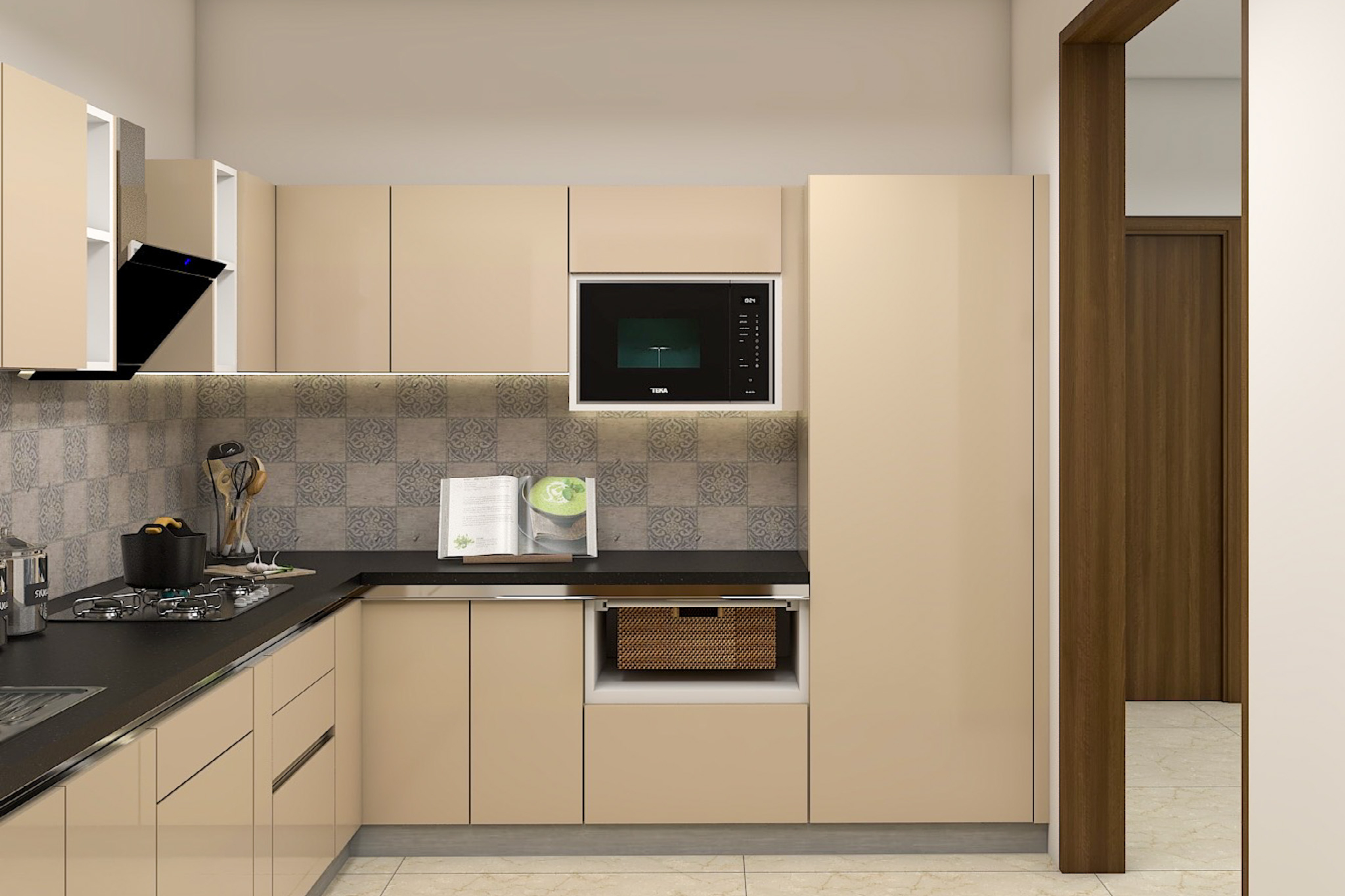 A modern L-shaped spacious kitchen design. The beige laminated cabinets with the cabinet lighting look lovely. The gola profile handles are seamless and easy to pull out. The black countertop gives a timeless look and complements the cabinet colour.