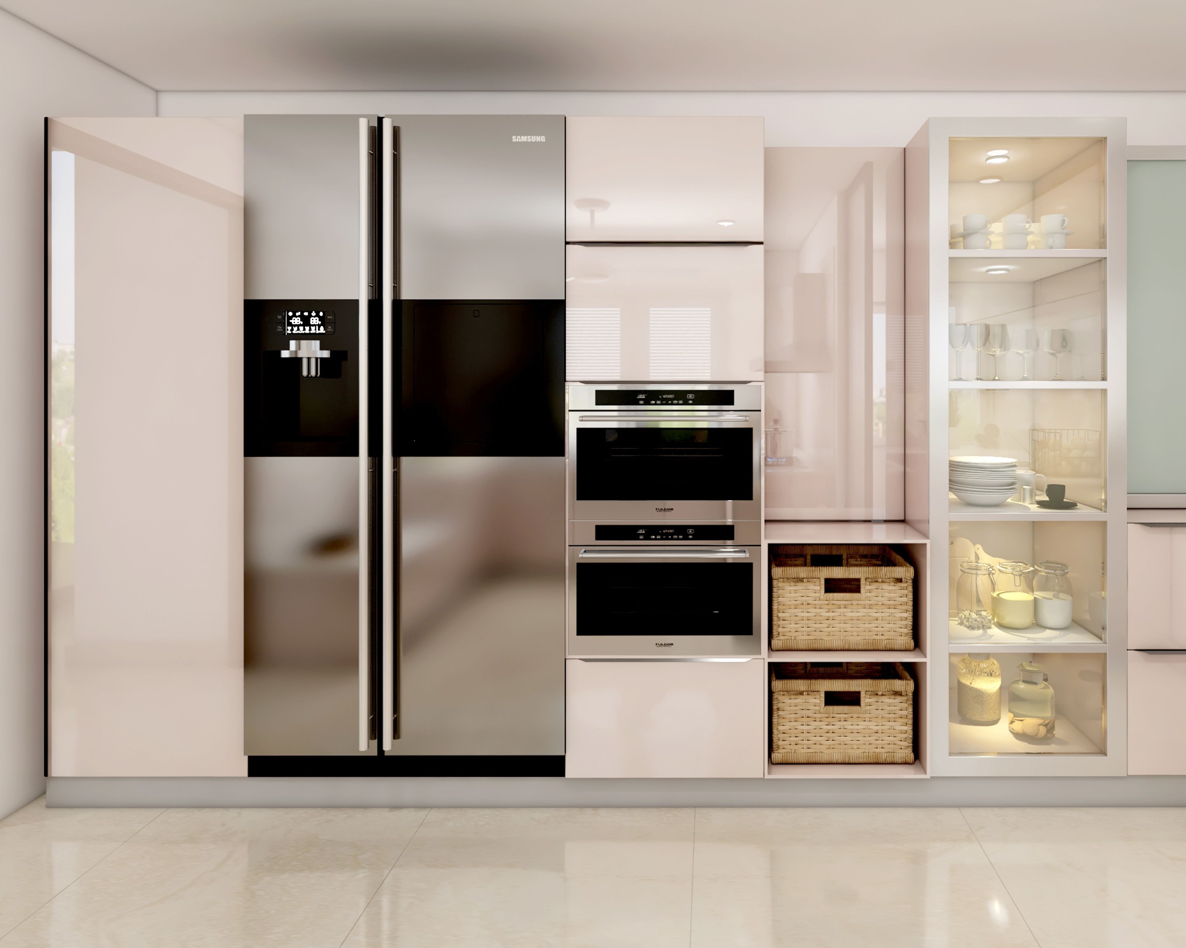 This kitchen cabinet design is a dream come true for any home chef. The glossy beige bottom units come alive with a white countertop and gola profile handles. The tall unit with aluminium-profiled glass shutters holds the oven and OTG units, making the space look well-organised.