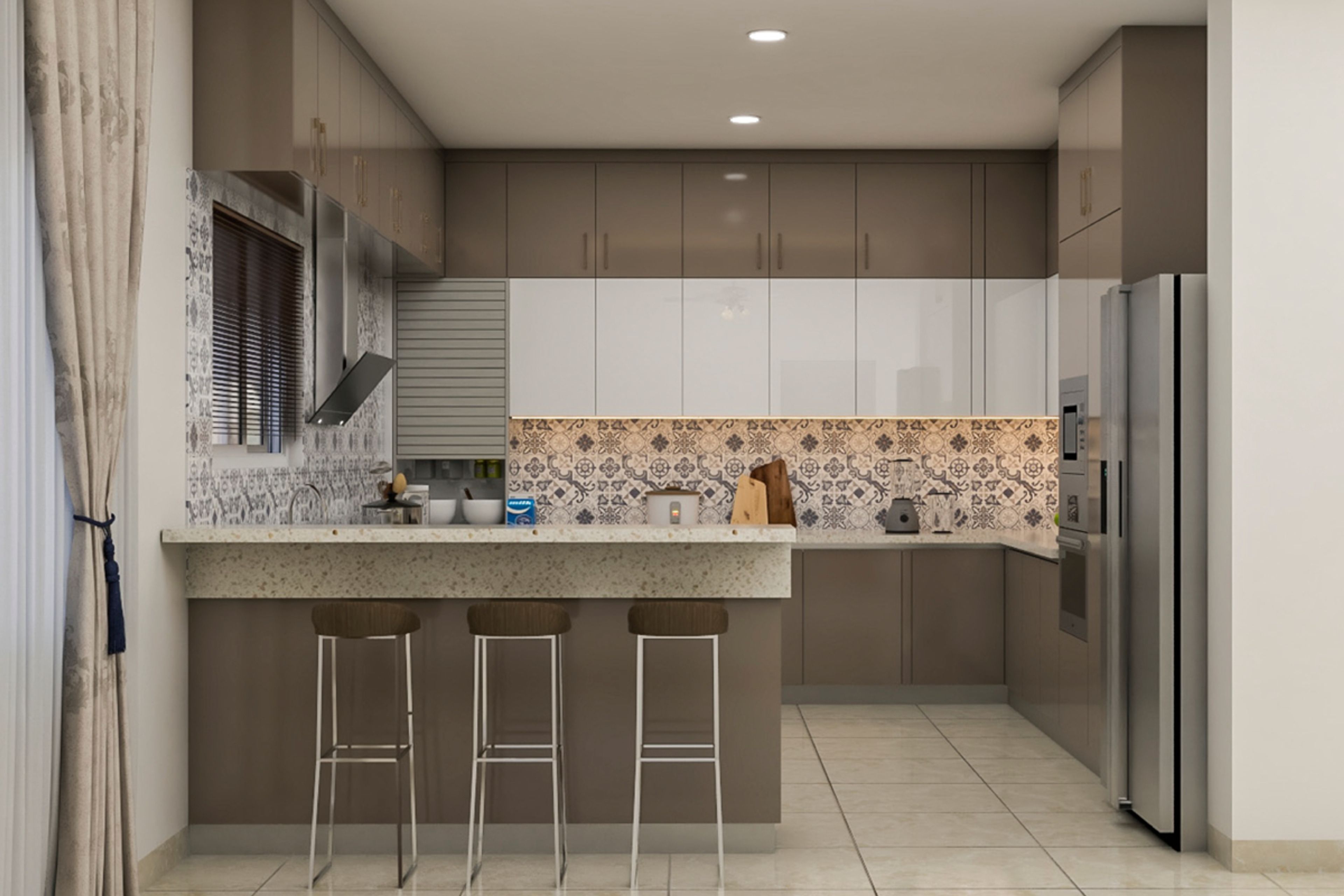 This modern kitchen design with a floral backdrop is the perfect way to spruce up your kitchen and give it a new look. The modular brown and white glossy kitchen cabinets look durable and sturdy, while the in-built appliances with large-size storage units make this kitchen design highly efficient. The profiled cove lights under the blue and white dado design also add to the subtle glow.
