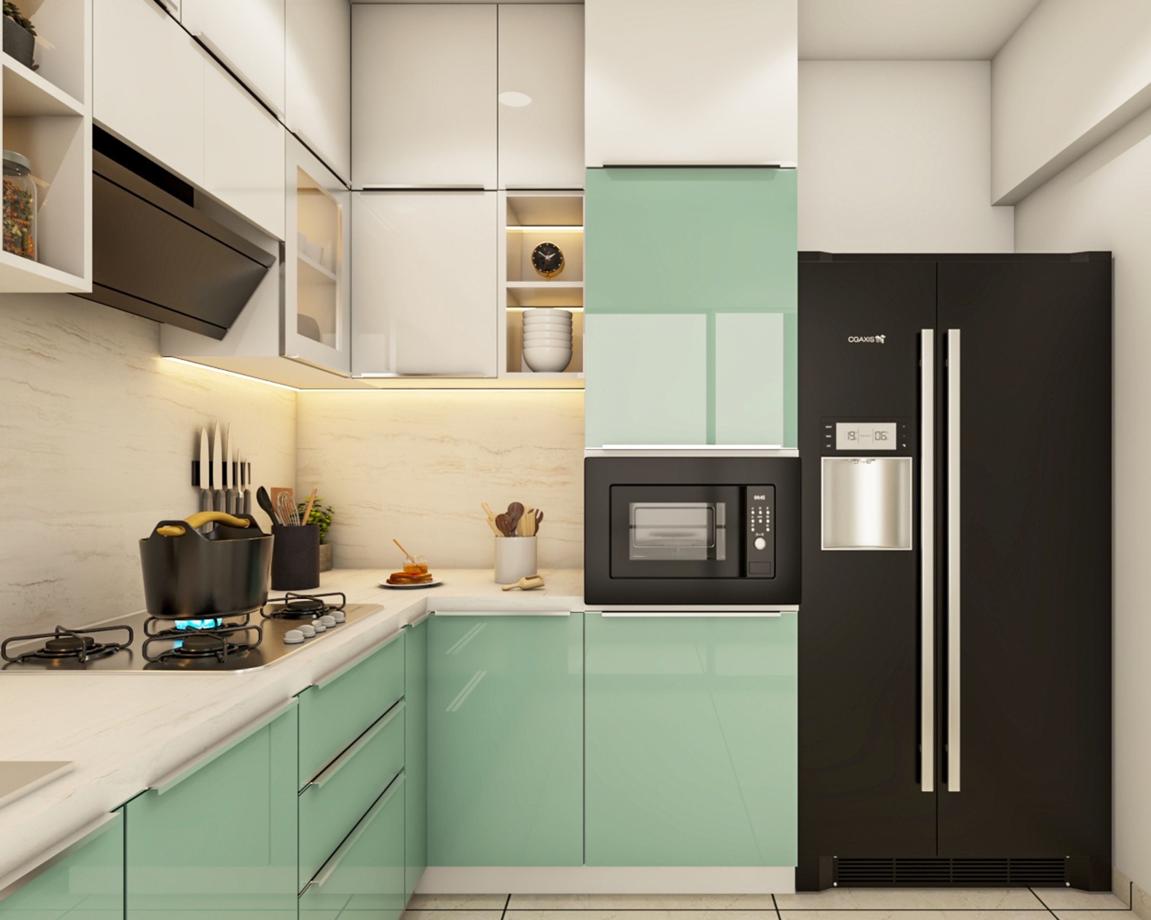 You can estimate the cost of Modern L-Shape Modular Kitchen Design With Aqua Green And Frosty White Cabinets easily using the Livspace Modular Kitchen Cost Calculator. Enter your kitchen size, materials, and finish preferences to receive a personalized price estimate instantly.