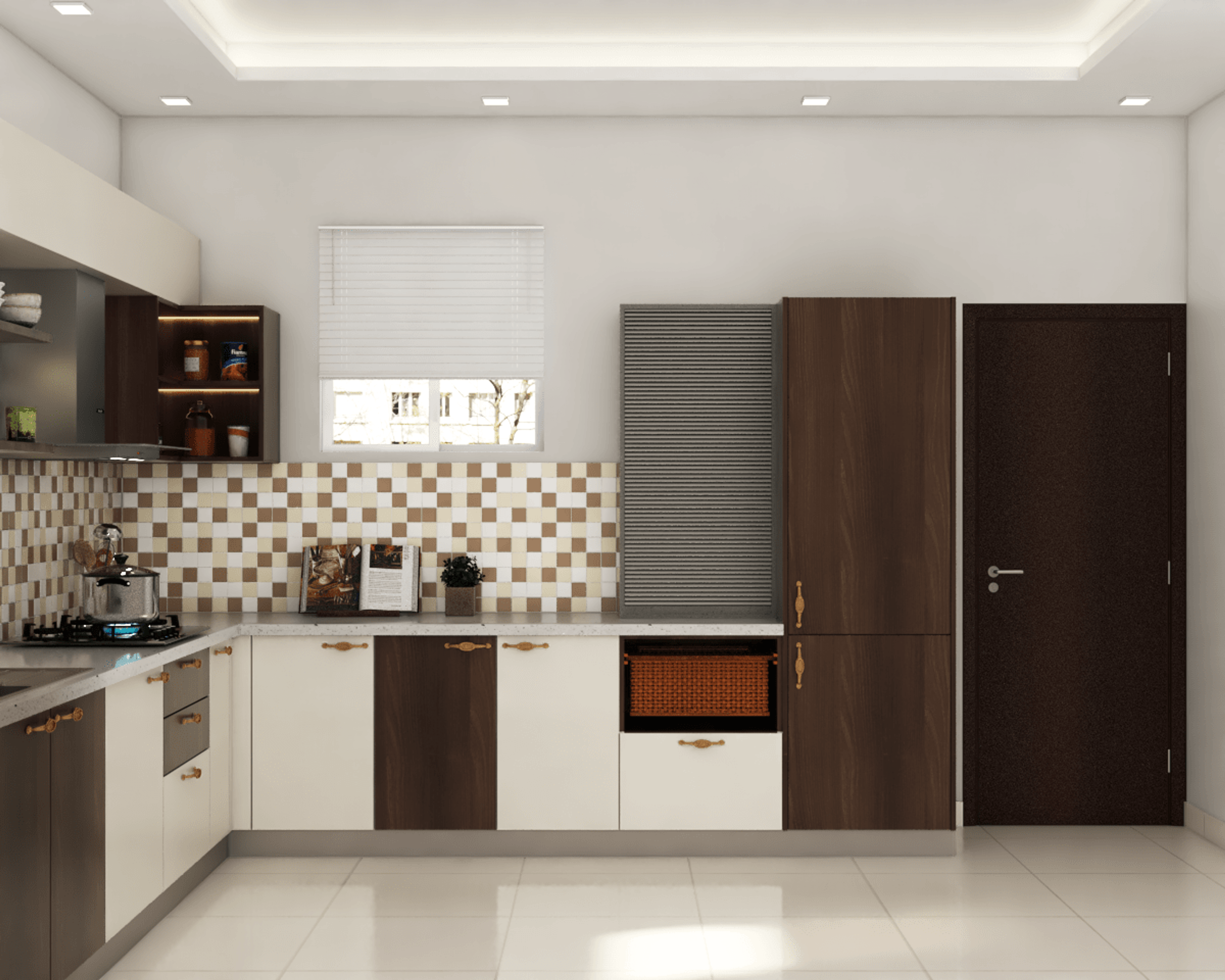 Modern L-Shaped Kitchen Design With Brown And White Tiles