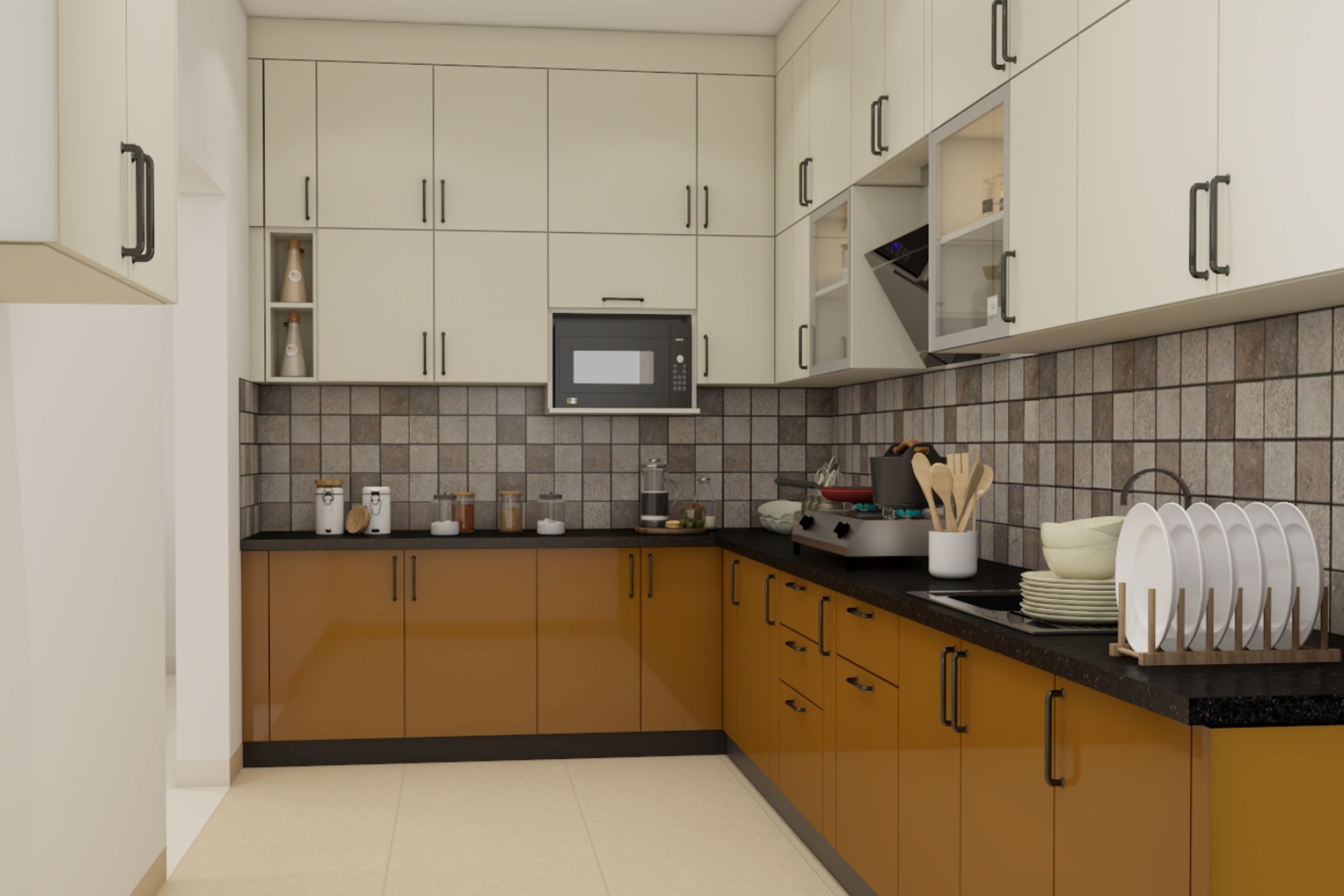 An L-shaped kitchen layout is ideal for homeowners who want an efficient workflow and maximum storage in a compact footprint. It provides an ergonomic design where the cooking, washing, and preparation zones are placed along adjacent walls to enhance functionality. Depending on your space, this layout can also be customized with modular cabinets, built-in appliances, and smart storage solutions to suit modern Indian homes.