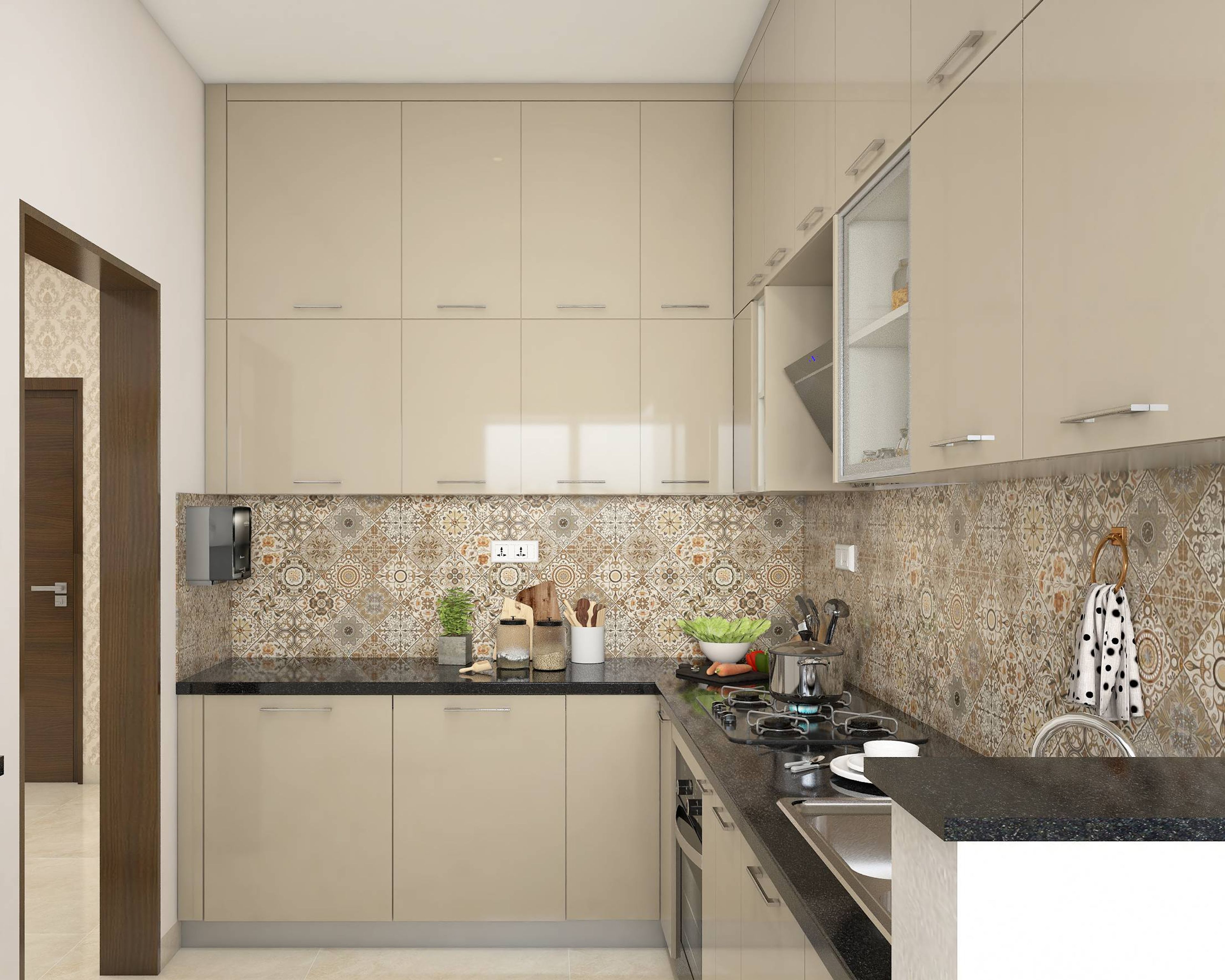 If you want a kitchen modular design with maximum convenience and easy maintenance, this beige-toned kitchen will suit you perfectly. The glossy beige finish cabinets with moisture resistance are easy to maintain while the multicolour patterned dado tiles contrast well with the black stone countertop. A janitor unit is also carefully designed on the side making it multifunctional and space-saving.