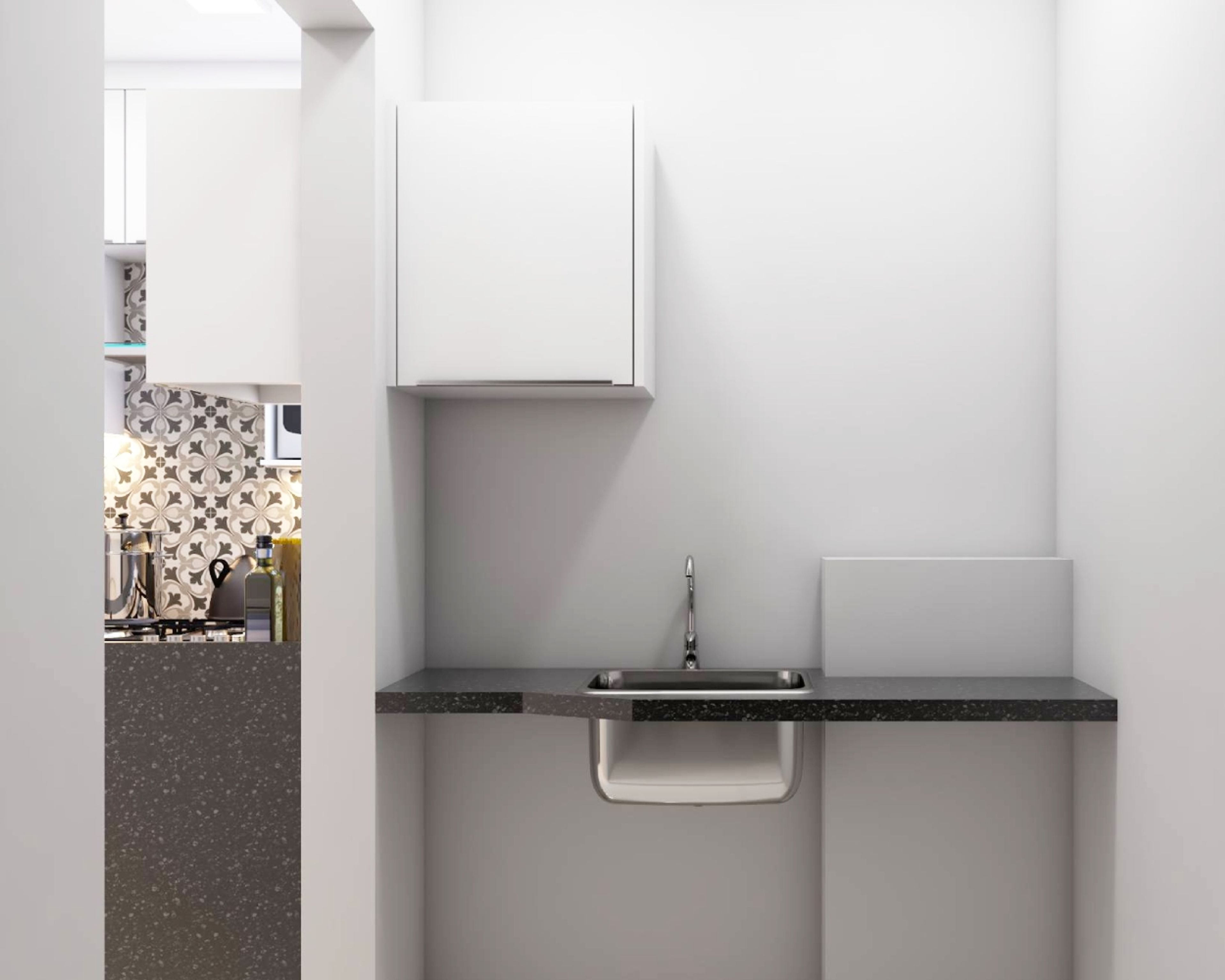 - Grey and white patterned dado tiles gives an aesthetically pleasing look.