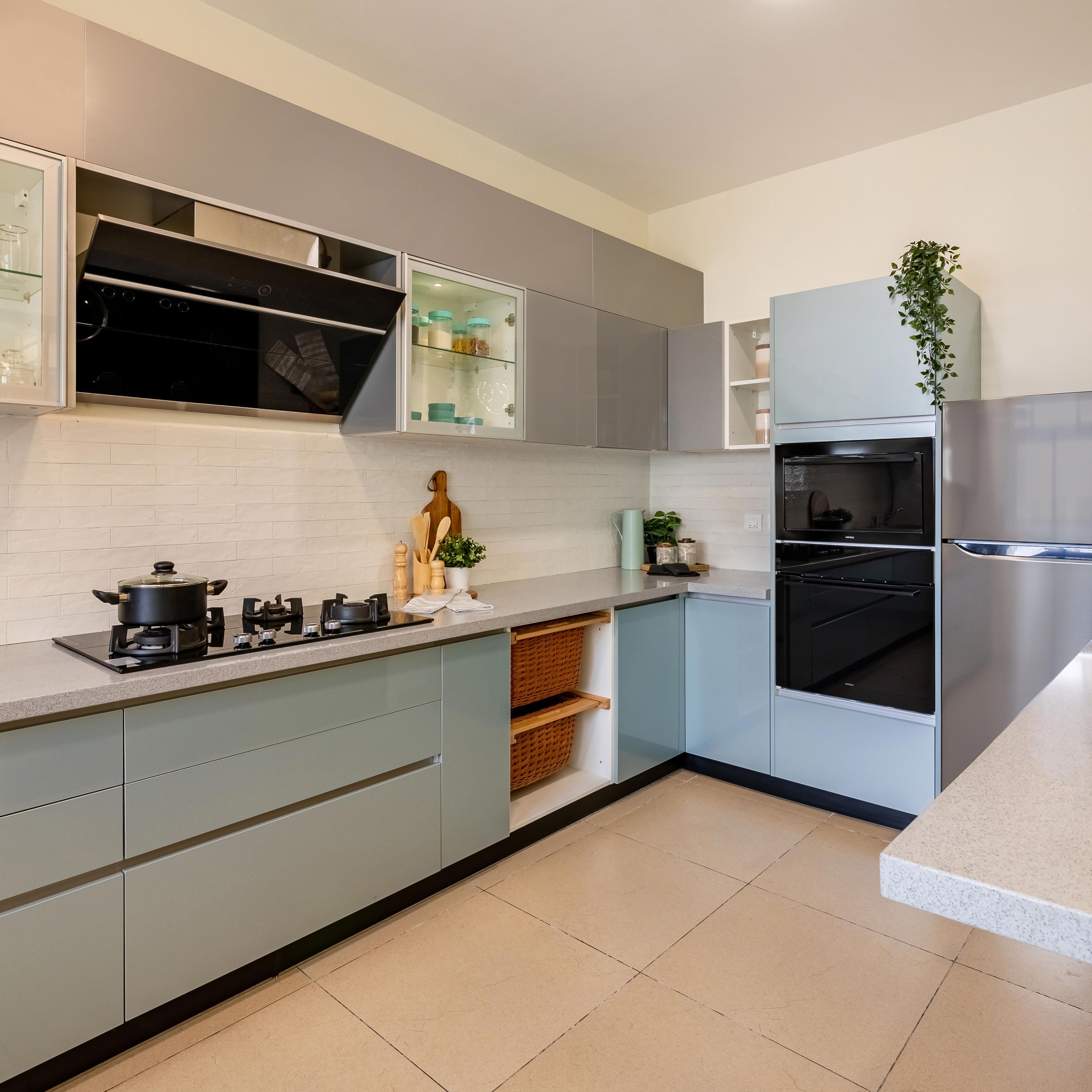 An L-shaped kitchen layout is ideal for homeowners who want an efficient workflow and maximum storage in a compact footprint. It provides an ergonomic design where the cooking, washing, and preparation zones are placed along adjacent walls to enhance functionality. Depending on your space, this layout can also be customized with modular cabinets, built-in appliances, and smart storage solutions to suit modern Indian homes.