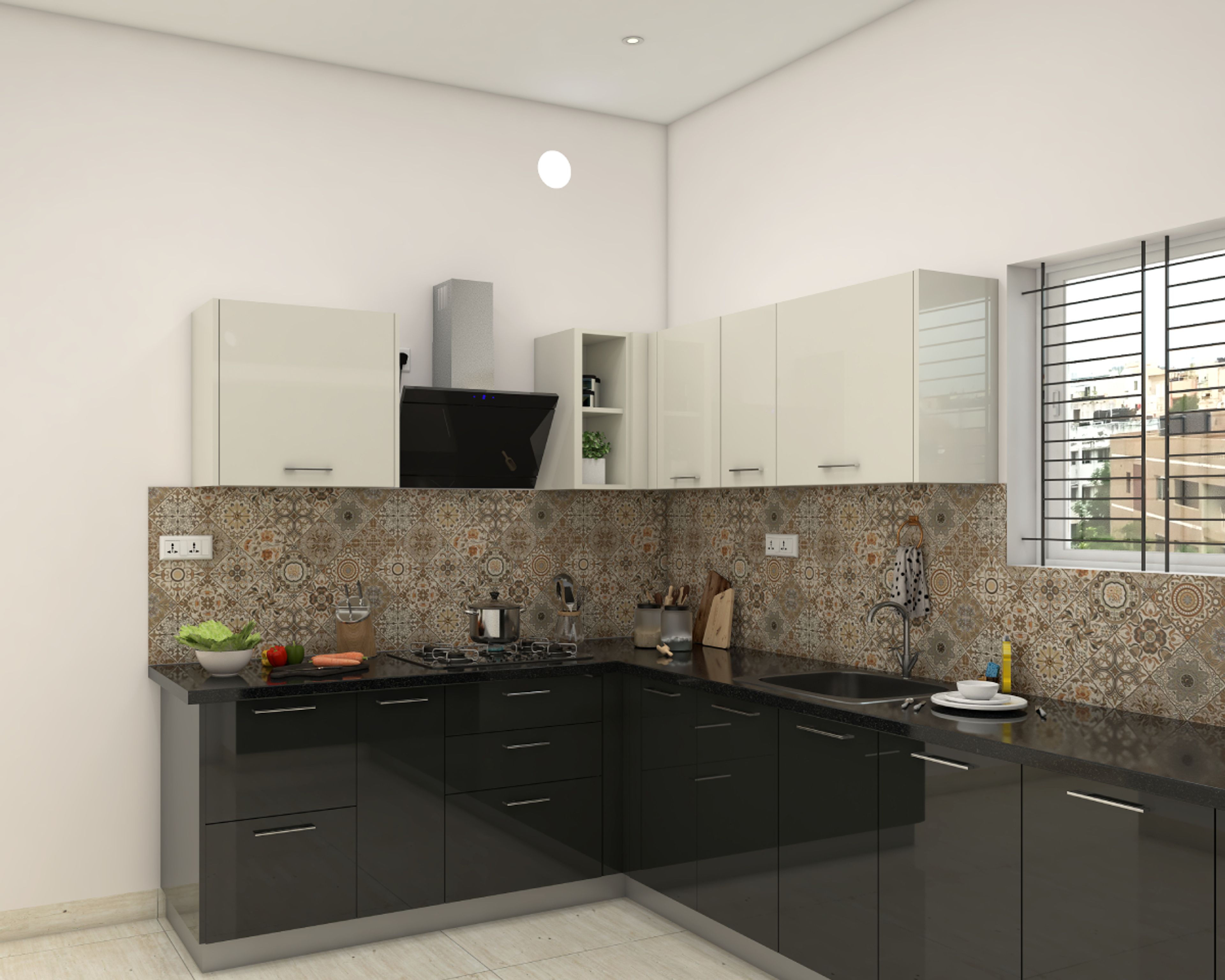 A modular kitchen designed for a spacious area. The glossy black laminate for the bottom units and glossy cream laminate for the wall units look nice. The open rack near the hob is easy to access. There is more storage space provided by adding lifts and tall units.