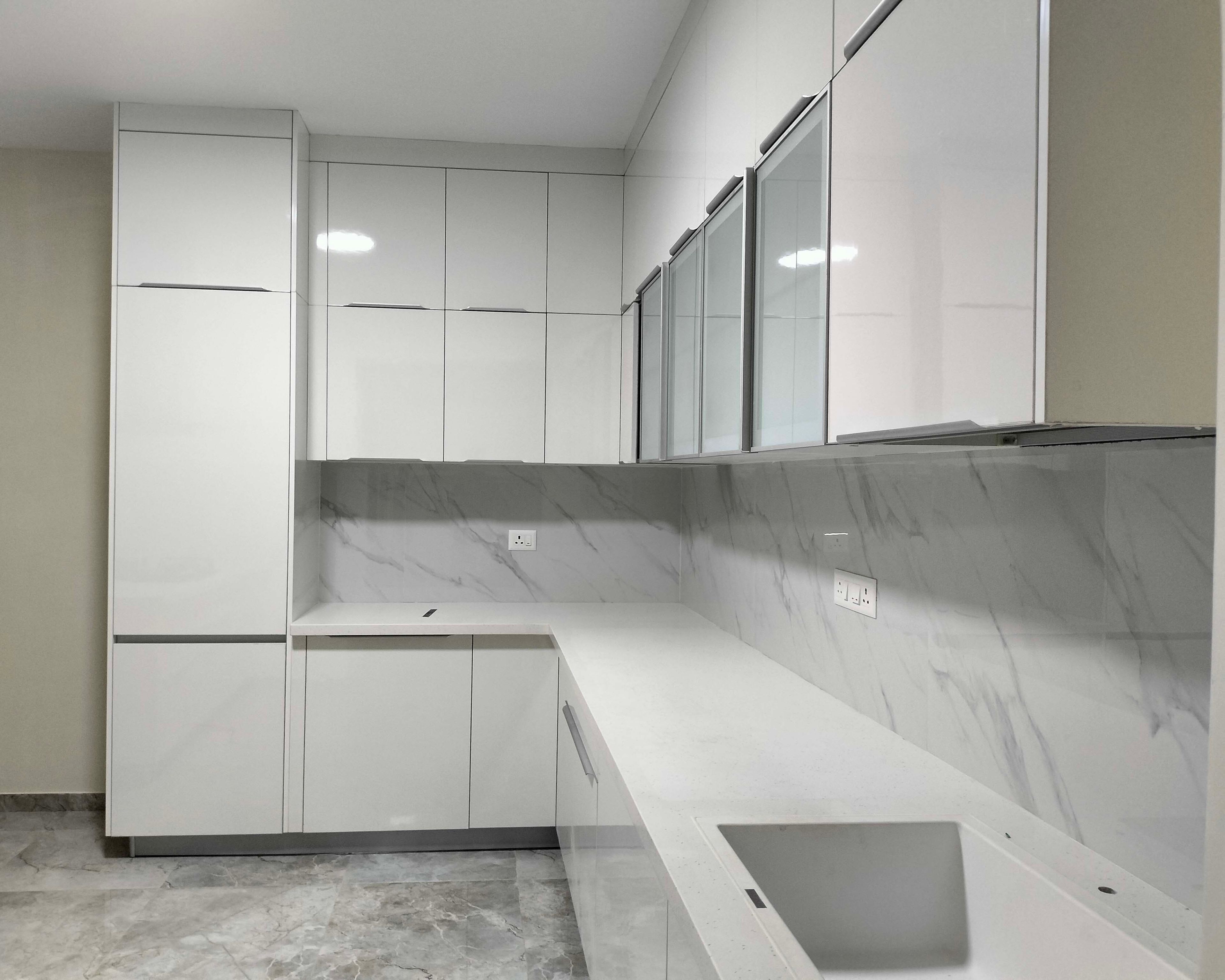 - Designed with a seamless and glossy frosty white finish, this kitchen features a durable quartz countertop, integrated chimney, and well-lit ambiance for a clean, modern look.