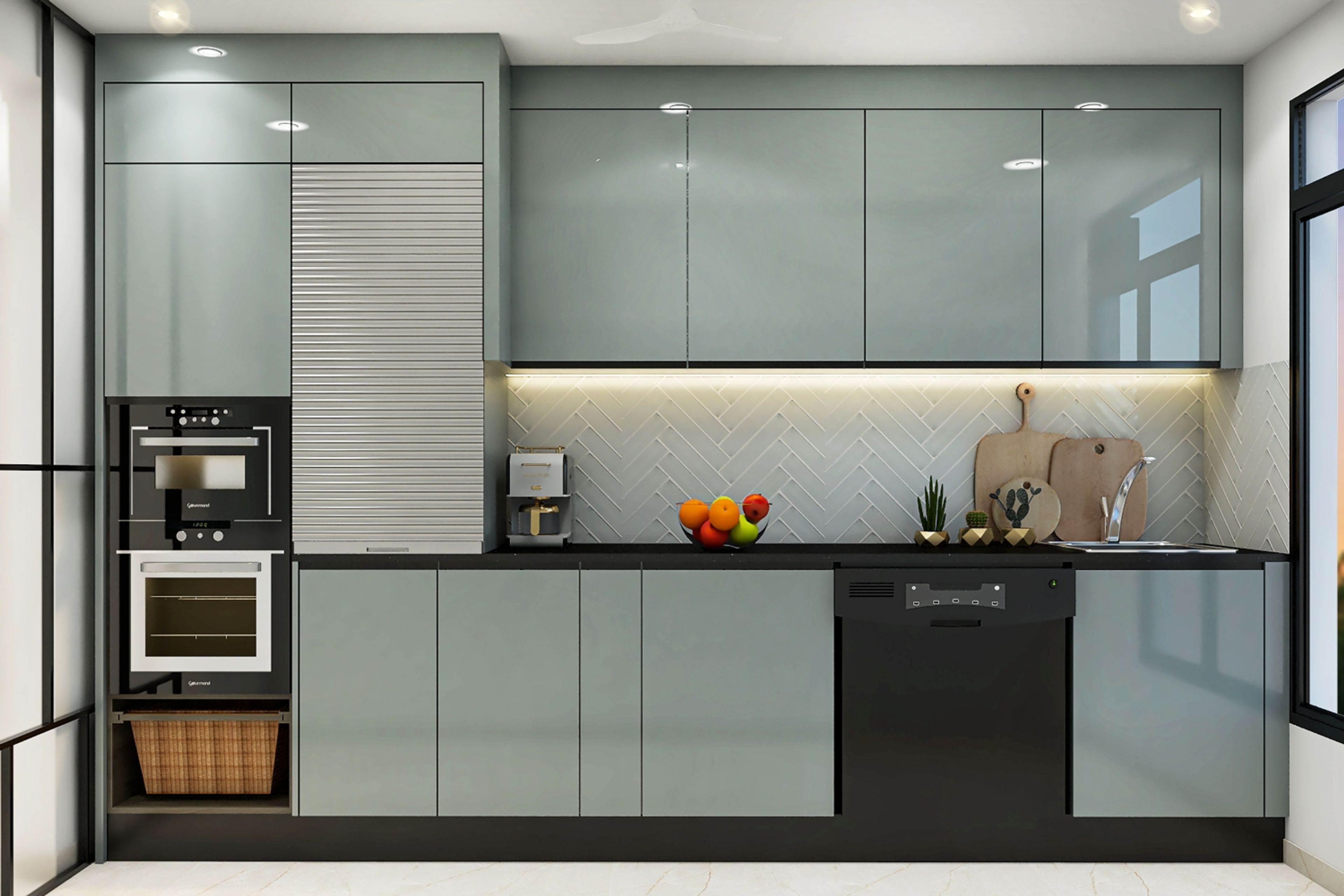 Storage Features: This kitchen features ample storage with sleek, high-gloss cabinets that blend seamlessly with the décor, including strategically placed shelves for easy access to essentials while keeping a minimalist look.