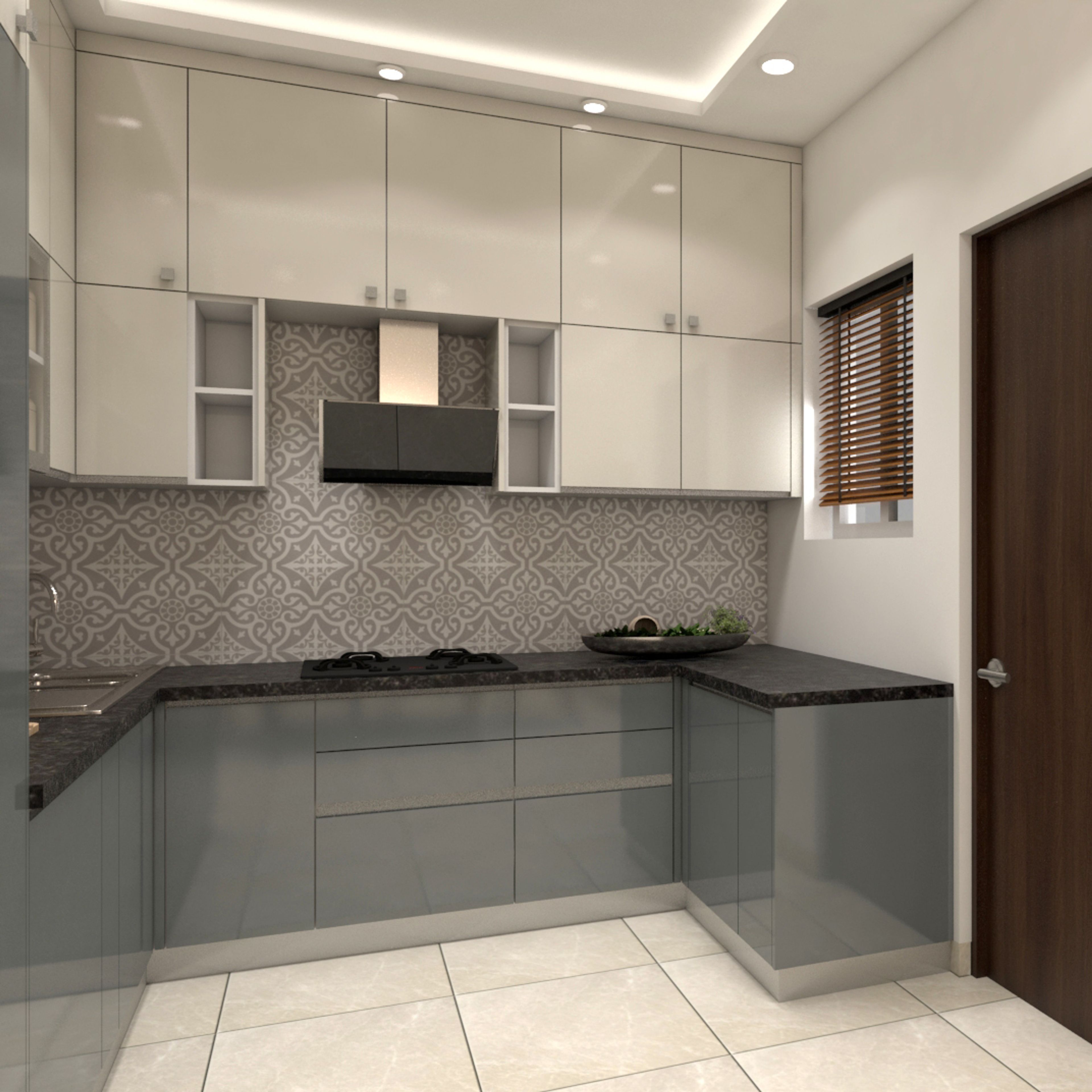 This U-shaped kitchen interior design gives a beautiful look with glossy blue and white storage cabinets. The combination of the blue lower cabinets and the black countertop looks good for this space, while the open units with profiled shutters near the hob are provided for easy access.