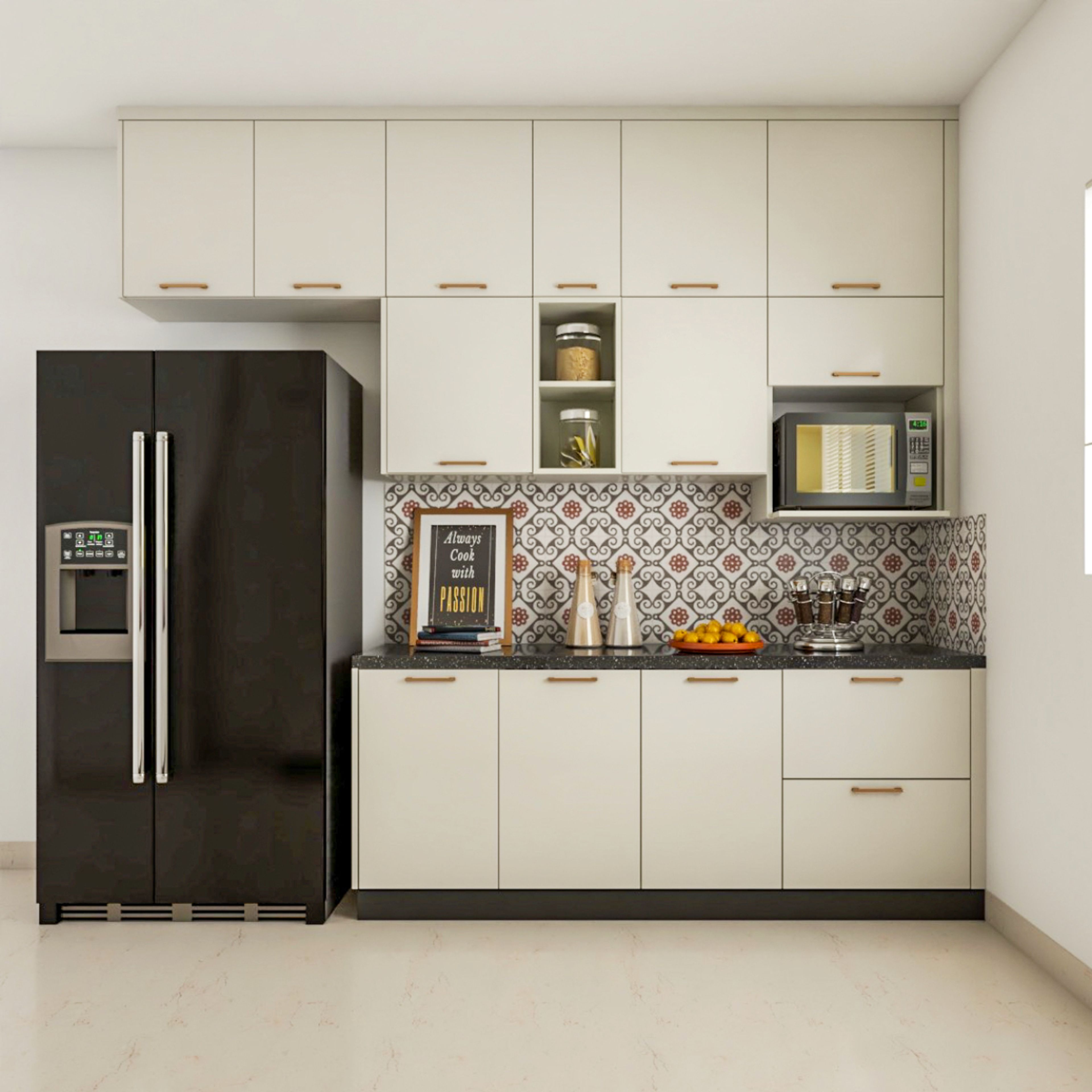 This full-white kitchen modular design gives an understated look with a black countertop and skirting. The golden handles add a luxury touch to the space. The wall units are also neatly organised with aluminium-profiled glass shutters and open units near the hob for easy access.