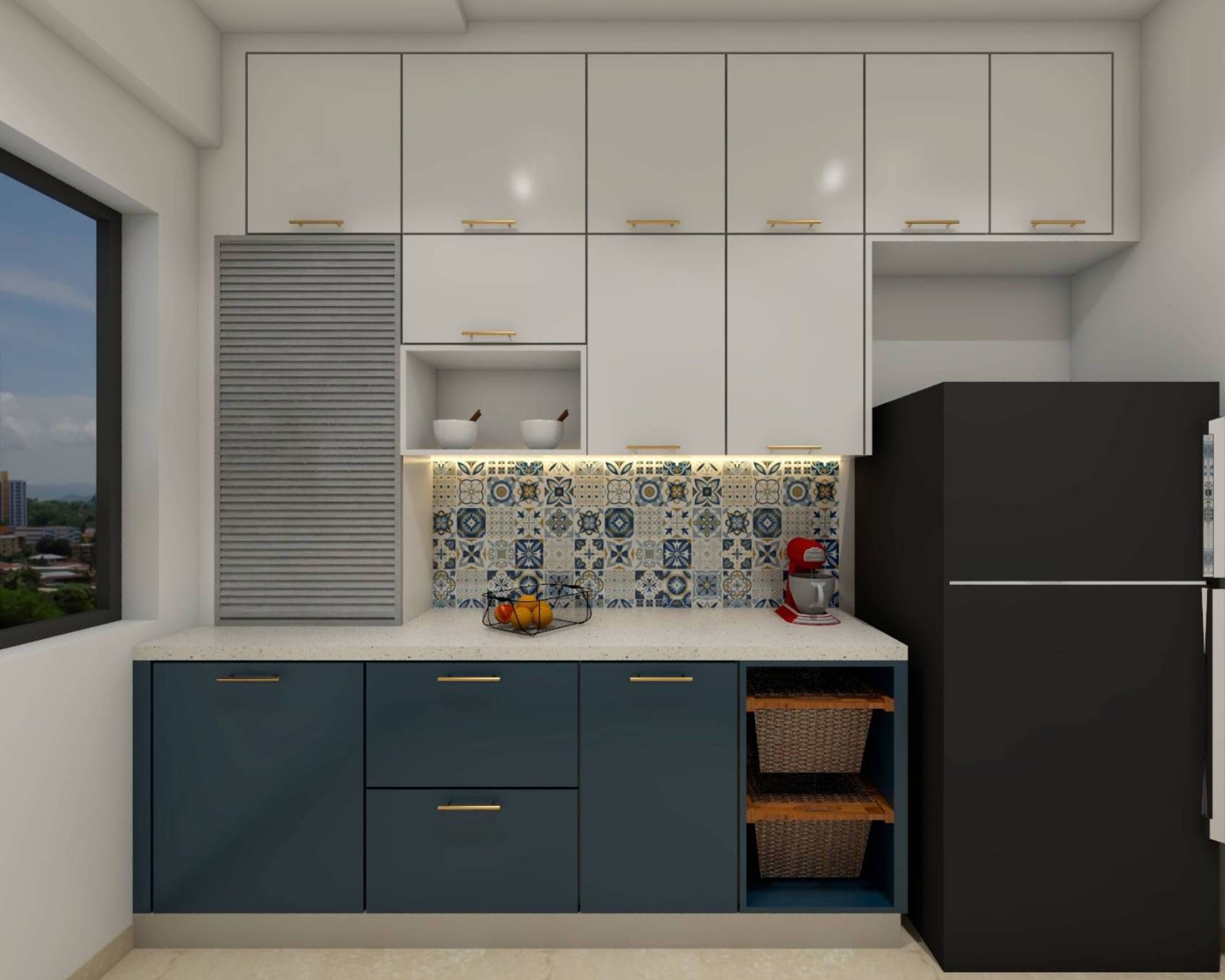 1. Blue and white patterned dado tiles go well with the white countertop