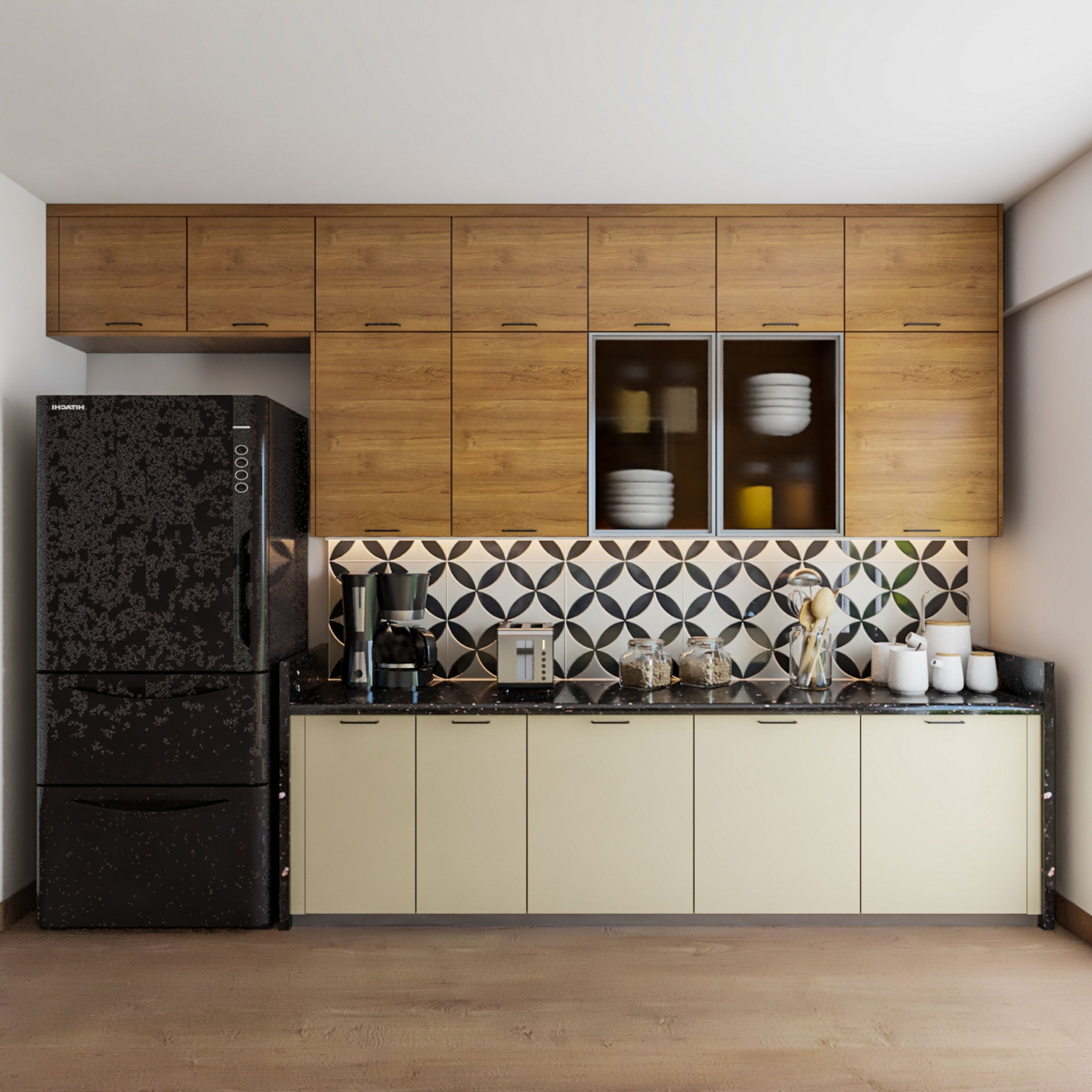 This beautiful and sleek parallel kitchen design idea is perfect for any home. With its black and white dado tiles and beige finish lower cabinets, it adds a touch of elegance to any kitchen. The tall unit finish with beige finish laminate holds the oven and microwave unit, making it highly functional and efficient. The upper dark wooden cabinets also give the kitchen a warm and inviting feel.