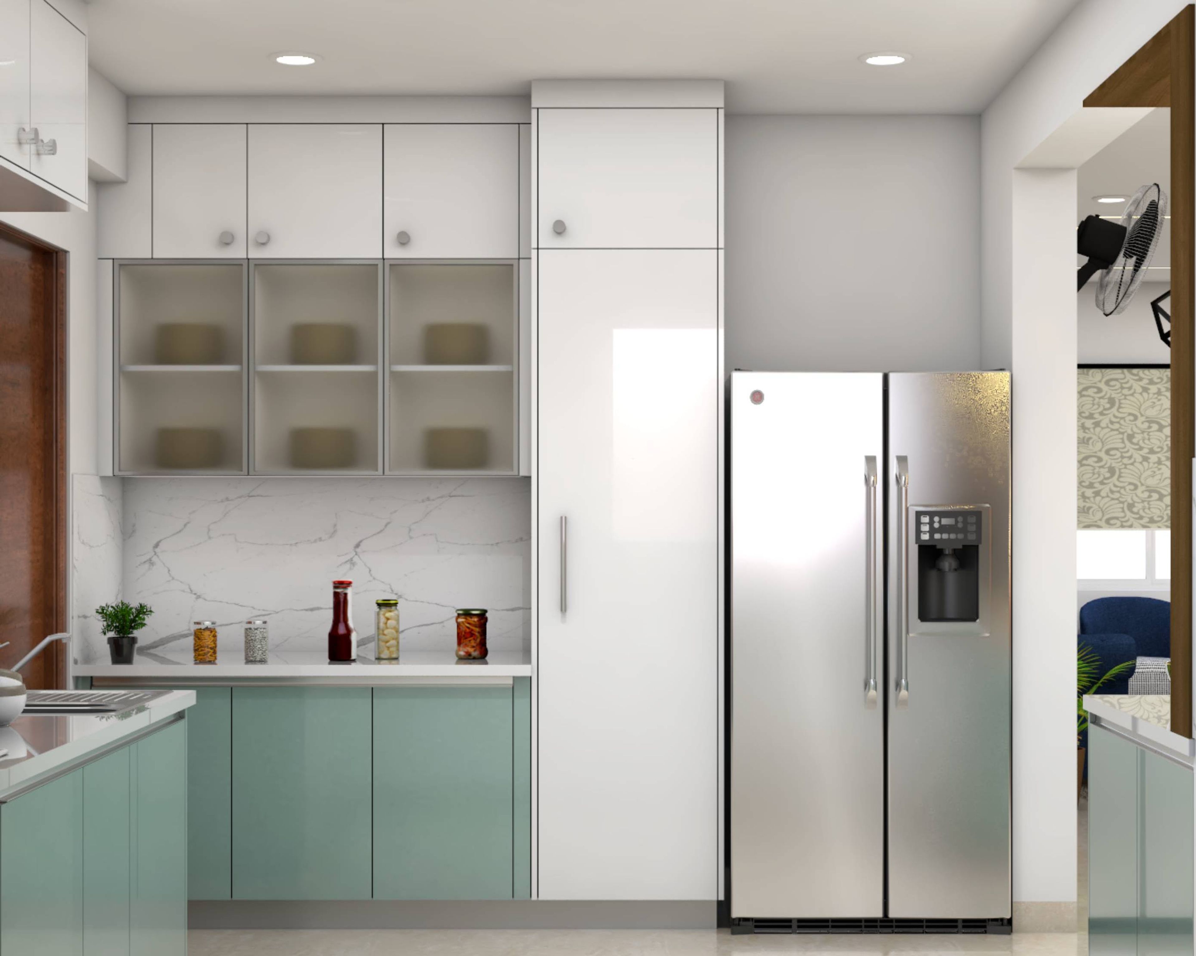 This lovely U-shaped modular kitchen design is both spacious and functional. The pastel blue lower cabinets blend well with the white top ceiling touch cabinets. The white marble backdrop complements the white countertop.