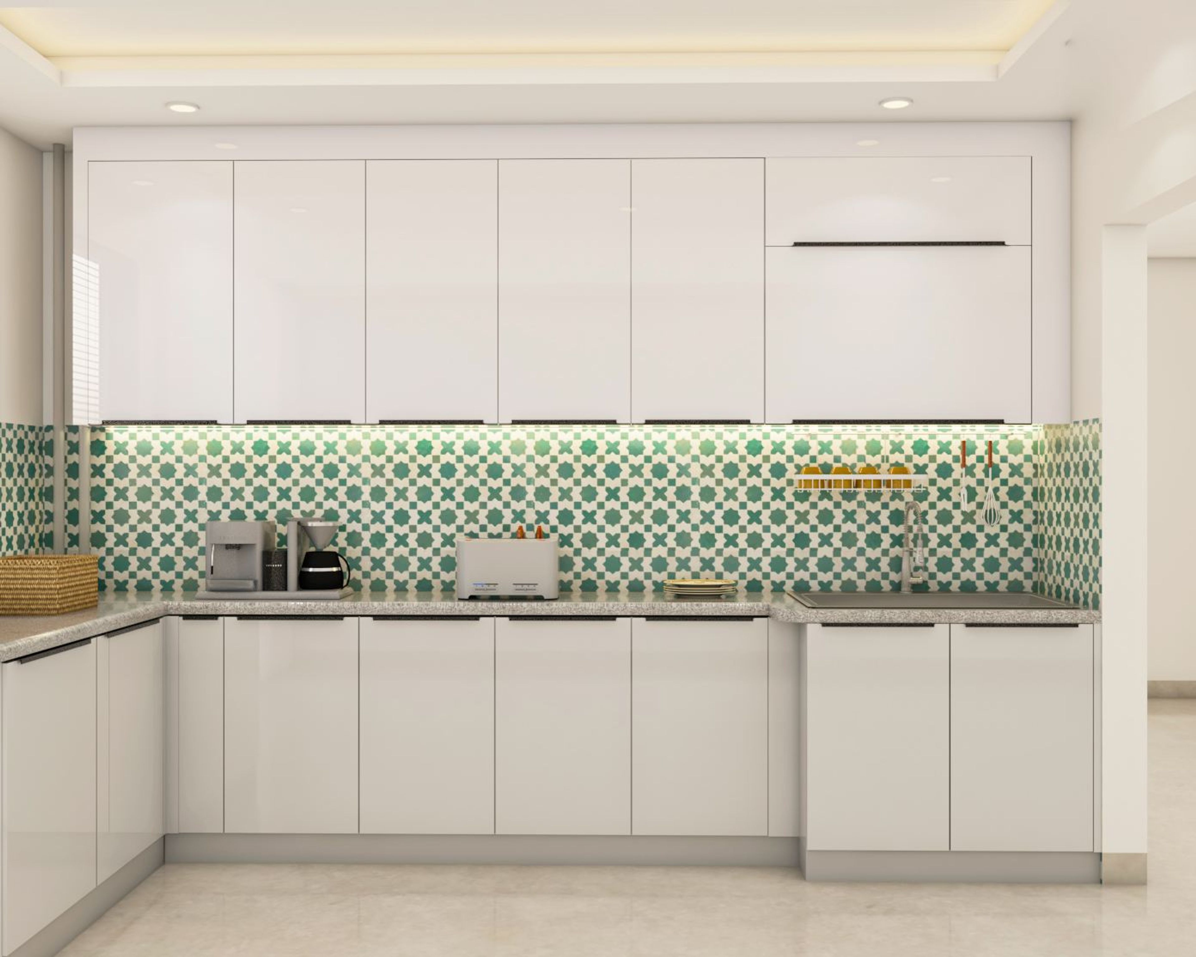 This modern kitchen design is both spacious and sleek. The U-shaped layout is a great space-saving hack and offers plenty of countertop and cabinet storage space. The plain white cabinets and the green dado tiles offer a striking visual contrast. The king black handles are sleek and are easy to use. The green patterned dado tiles add vibrance to the kitchen design.