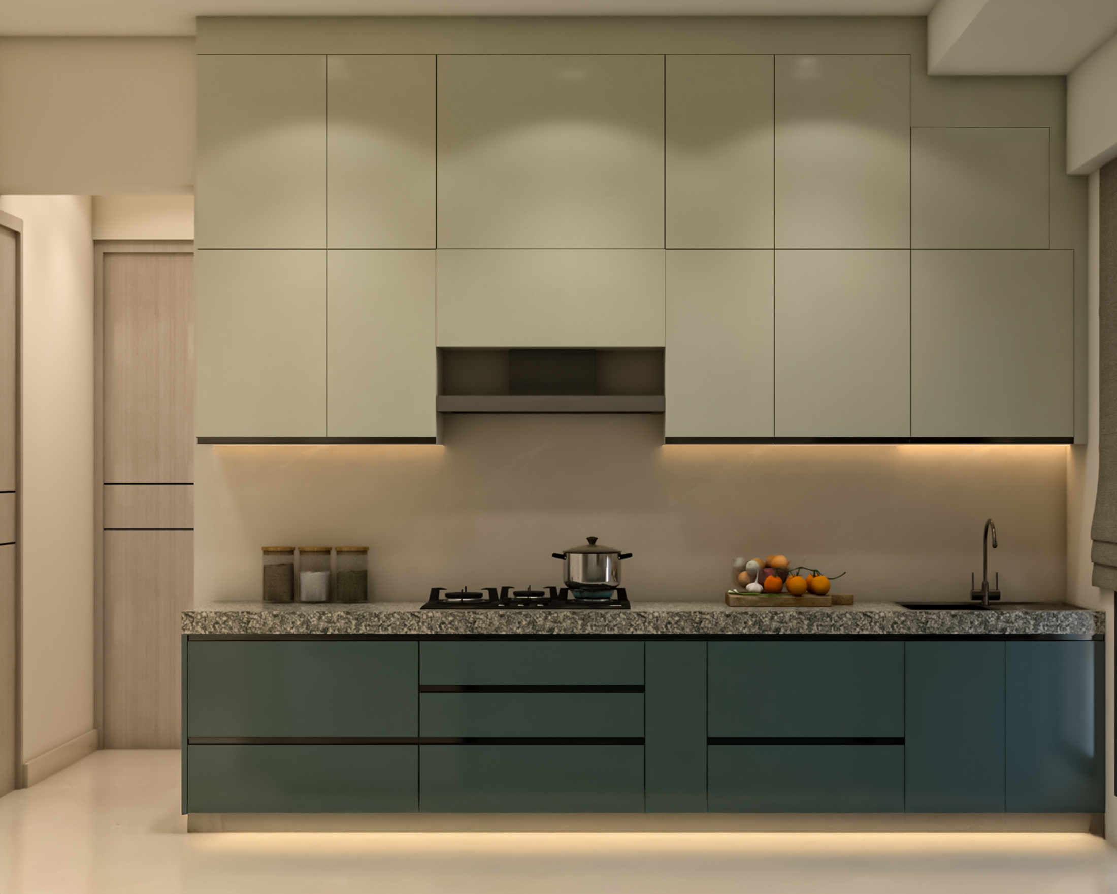 Experiment With Cabinet Lighting Overhead cabinets tend to cast shadows over countertops, which is why adequate under-cabinet lighting for a modular kitchen in Kolkata is essential. Under-cabinet task lighting or cove lighting can help illuminate the countertop, offering adequate lighting for food preparation and cooking.