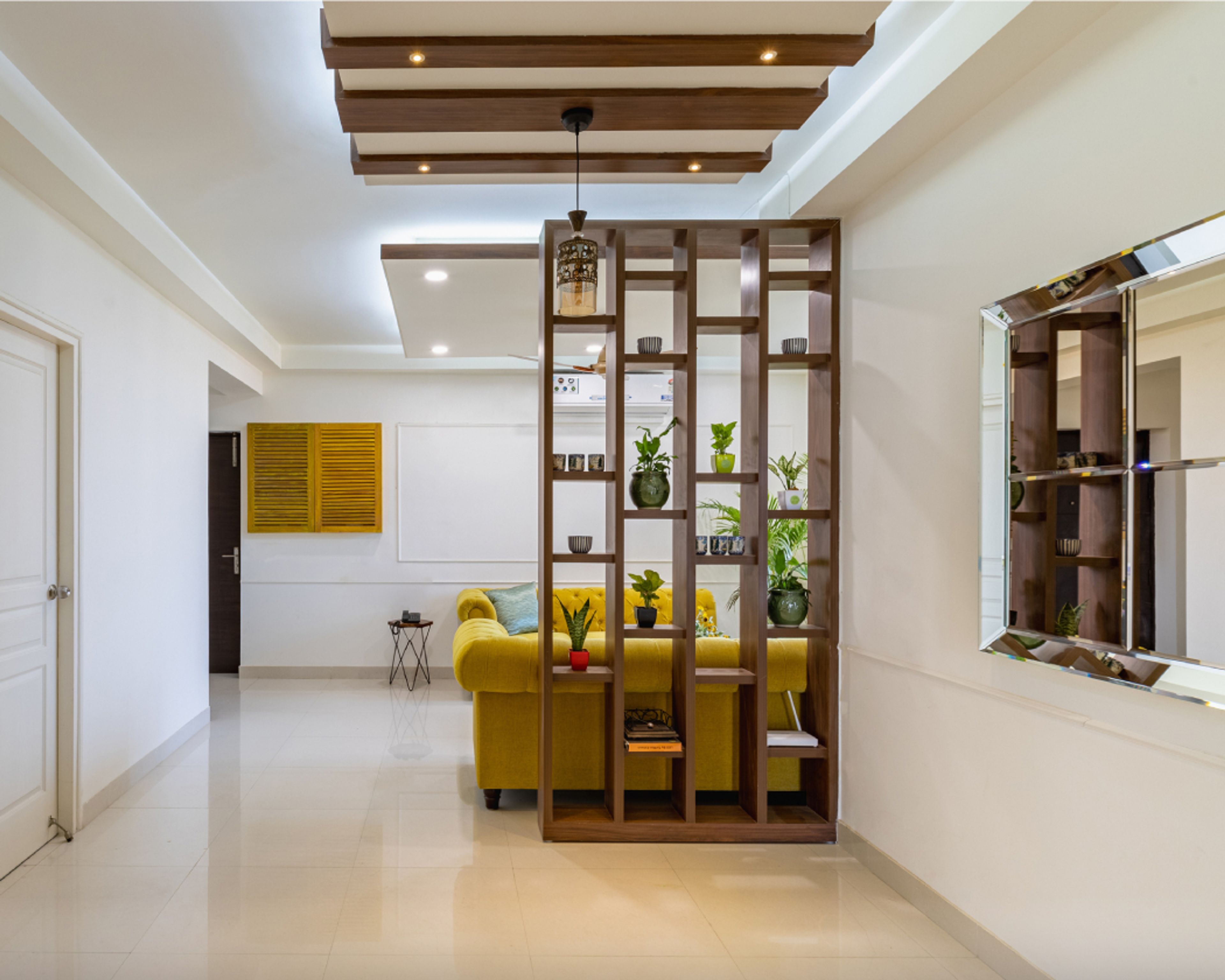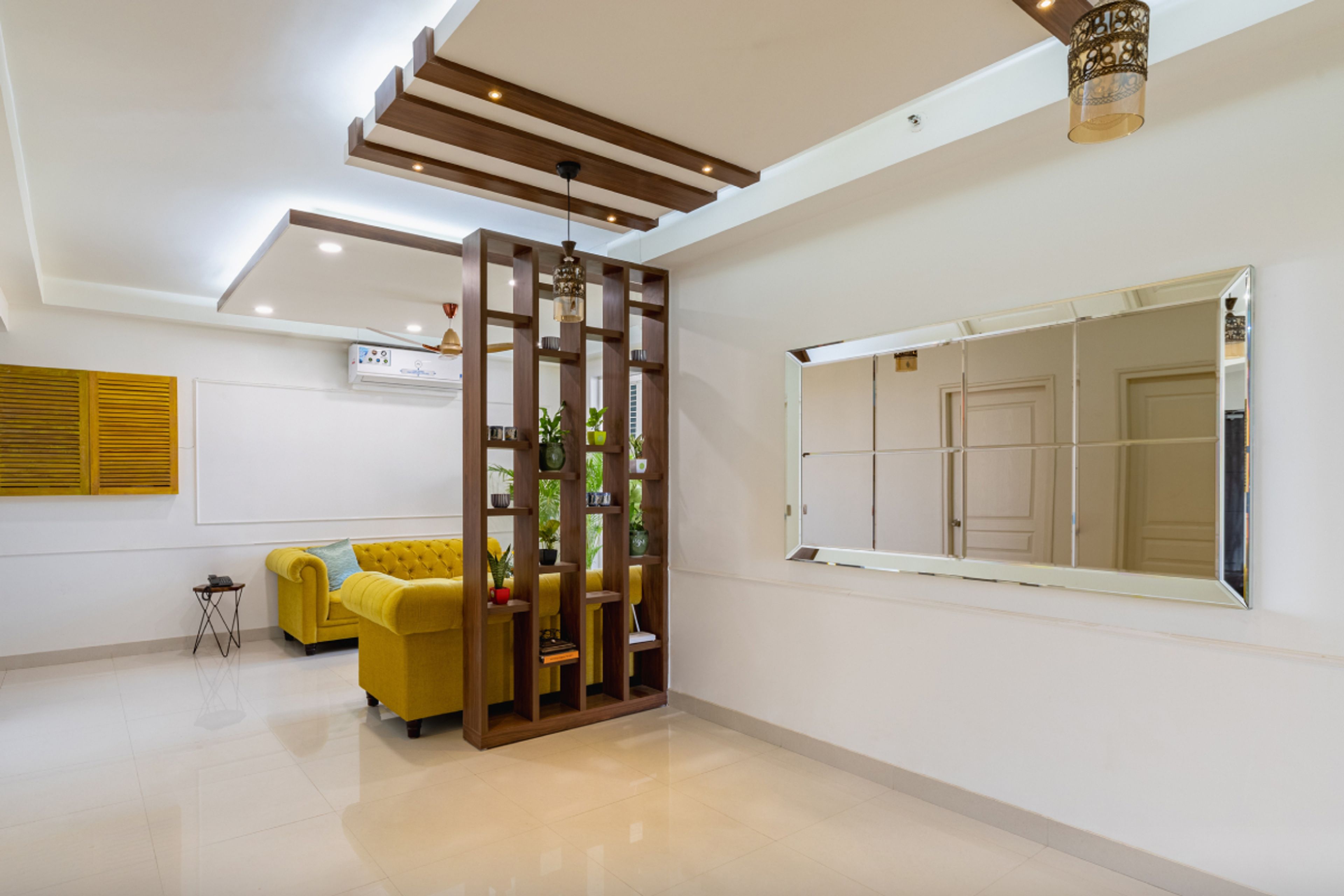 • Room Highlights: Wooden partition enhances functionality while lending a luxurious touch to the living room design