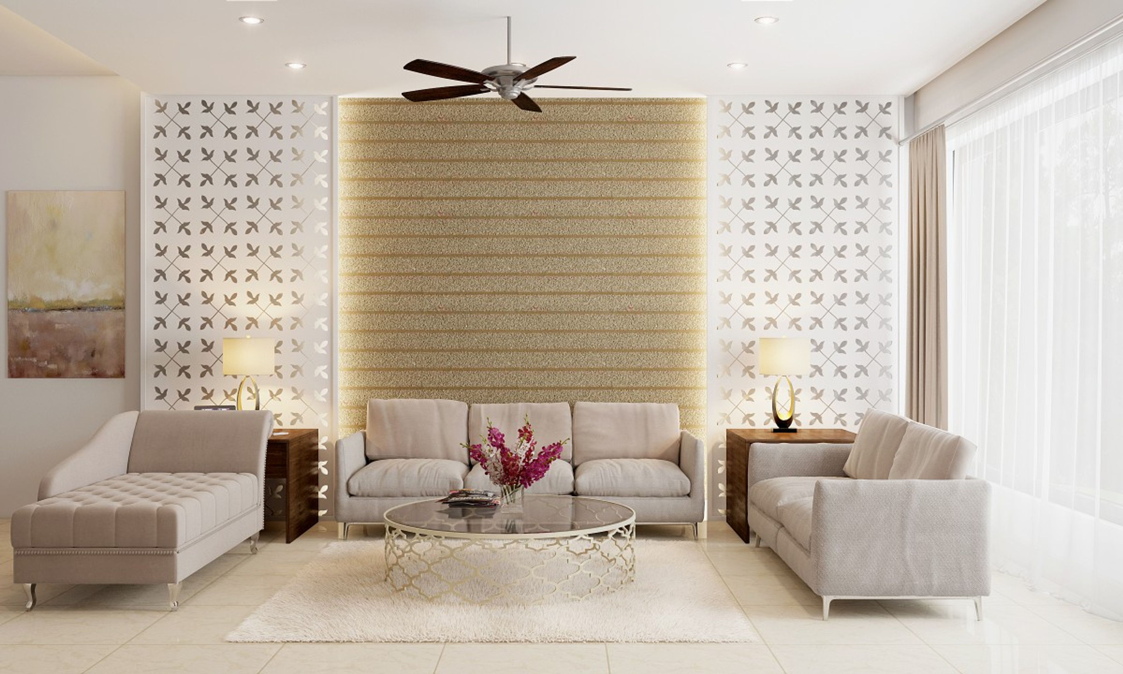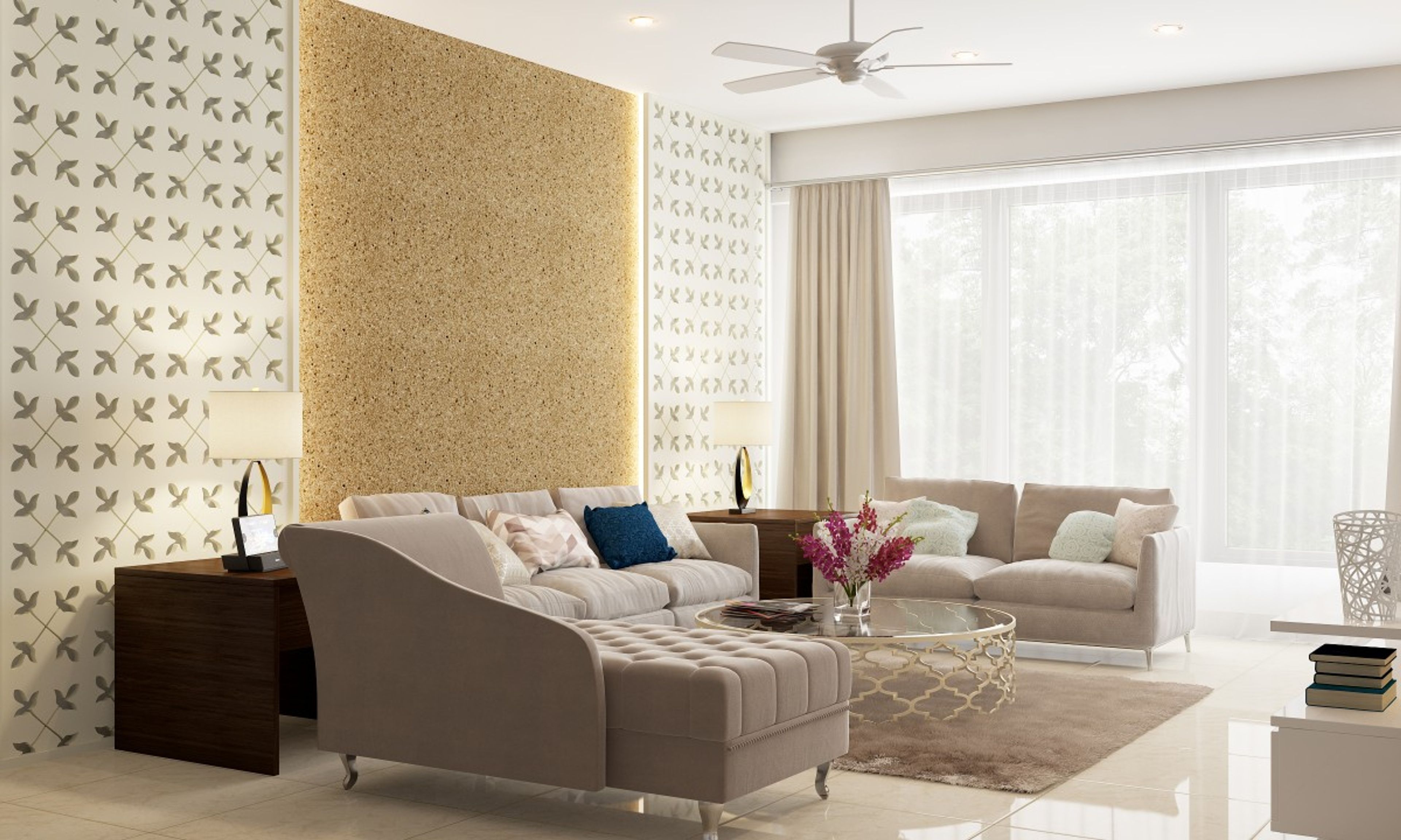 Stylishly executed, this classy living area’s use of snow white palette and swanky furnishings makes for an alluring composition.   A charming set of  plush, comfortable sofas and chaise longue coupled with the sleek, floating TV give the room an upscale feel. Plenty of sunlight gracing the living room opens up the space.