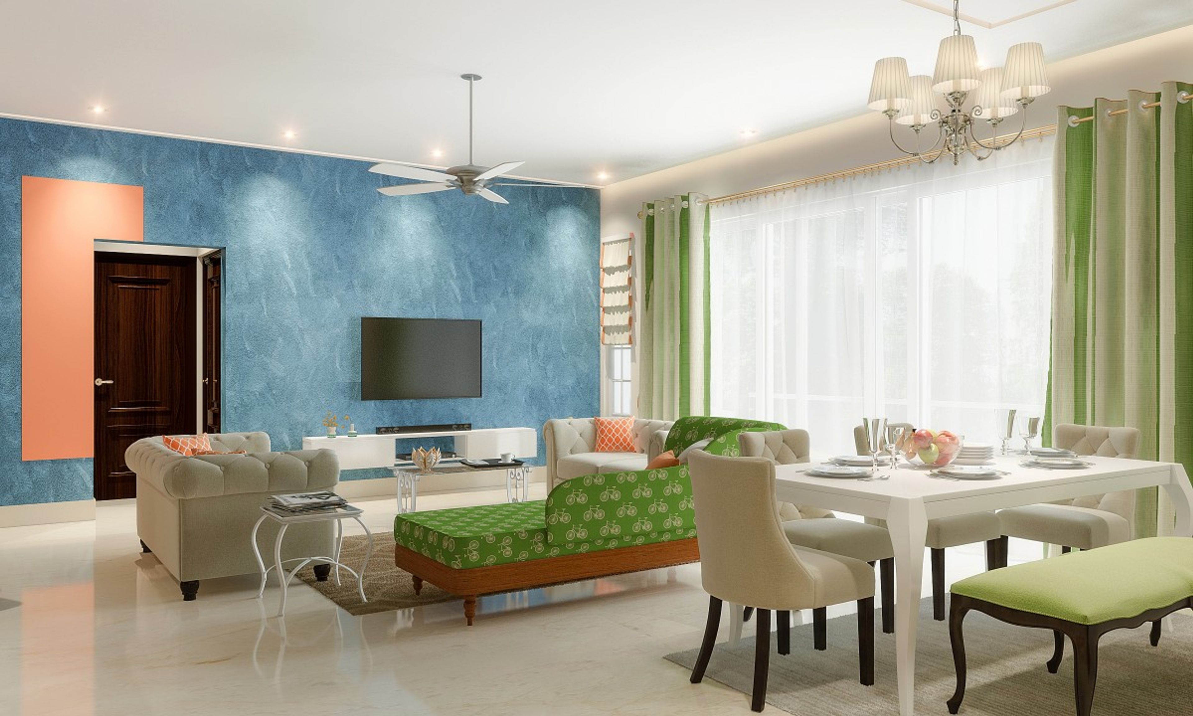 The eye-catchy parakeet diwan sets this living room apart by emboldening it with ethnic energy amongst the other modern pieces.   The button tufted ivory sofas and pure white walls give this room an air of elegance, while the layered parakeet drapes offset the bold diwan.