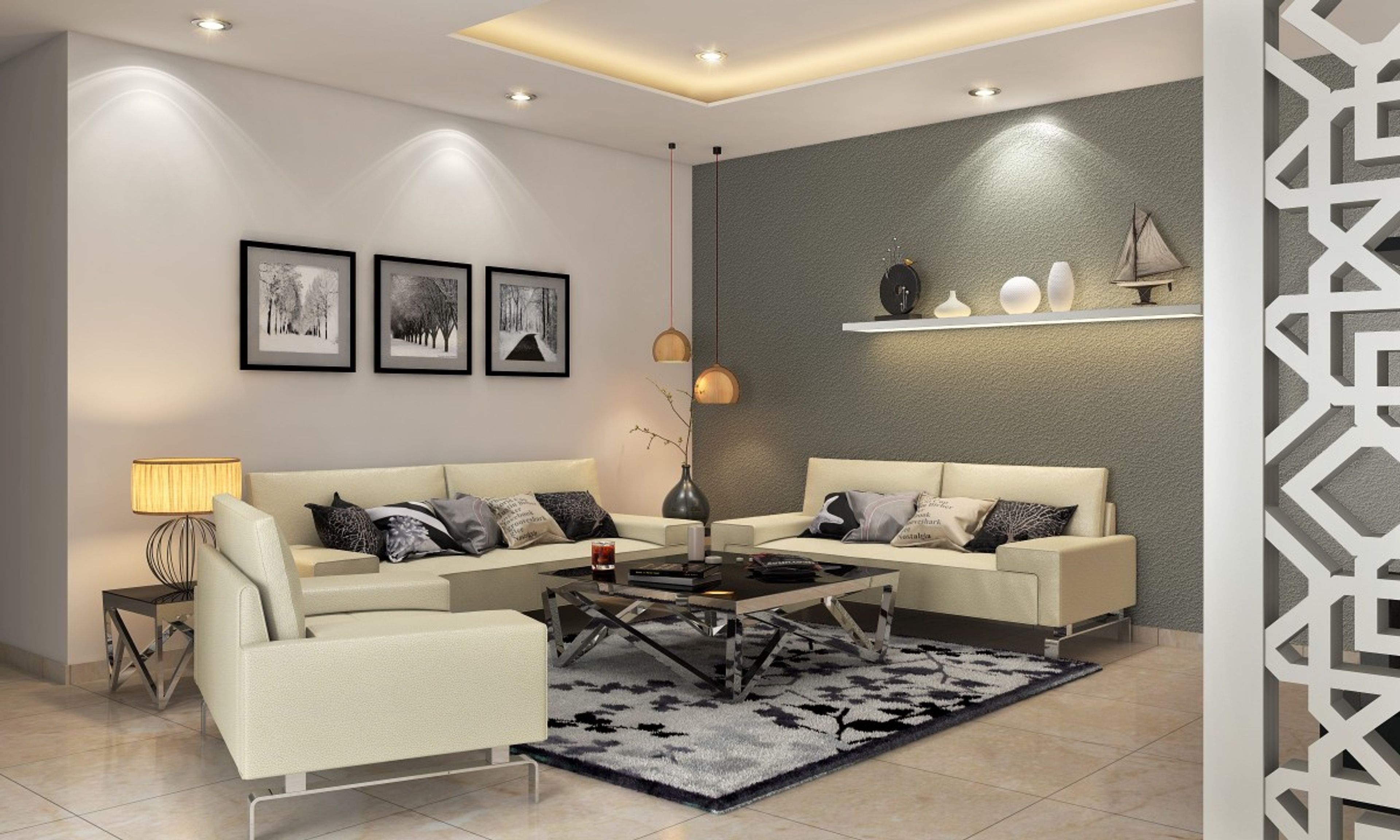 A monochromatic theme and stylish accent pieces come together splendidly in this upscale contemporary living room.   The crisp, gleaming center table exudes sophistication and stands out beautifully amidst the ivory-hued sofas. A pair of brass pendant lights add interesting detail to this space.