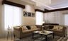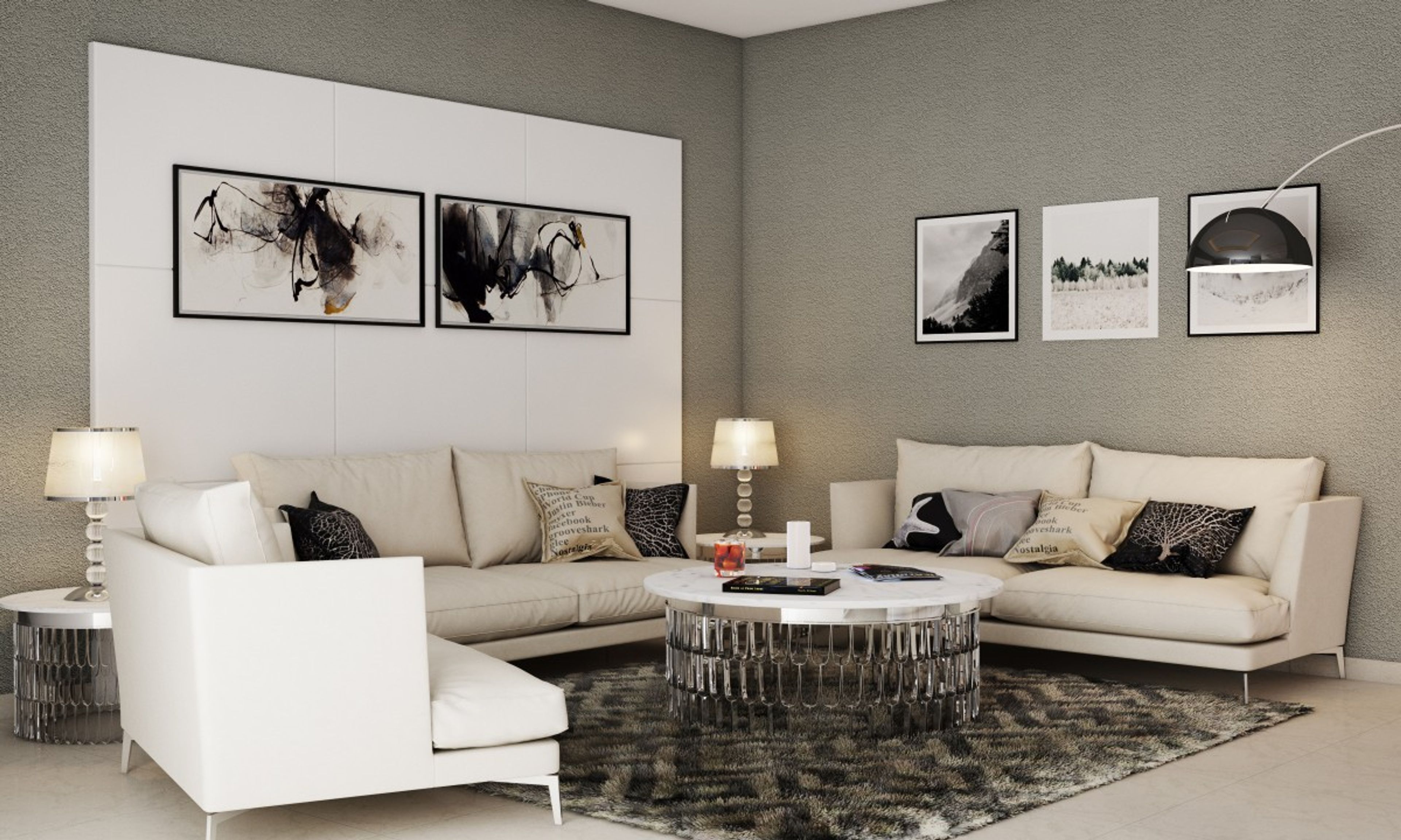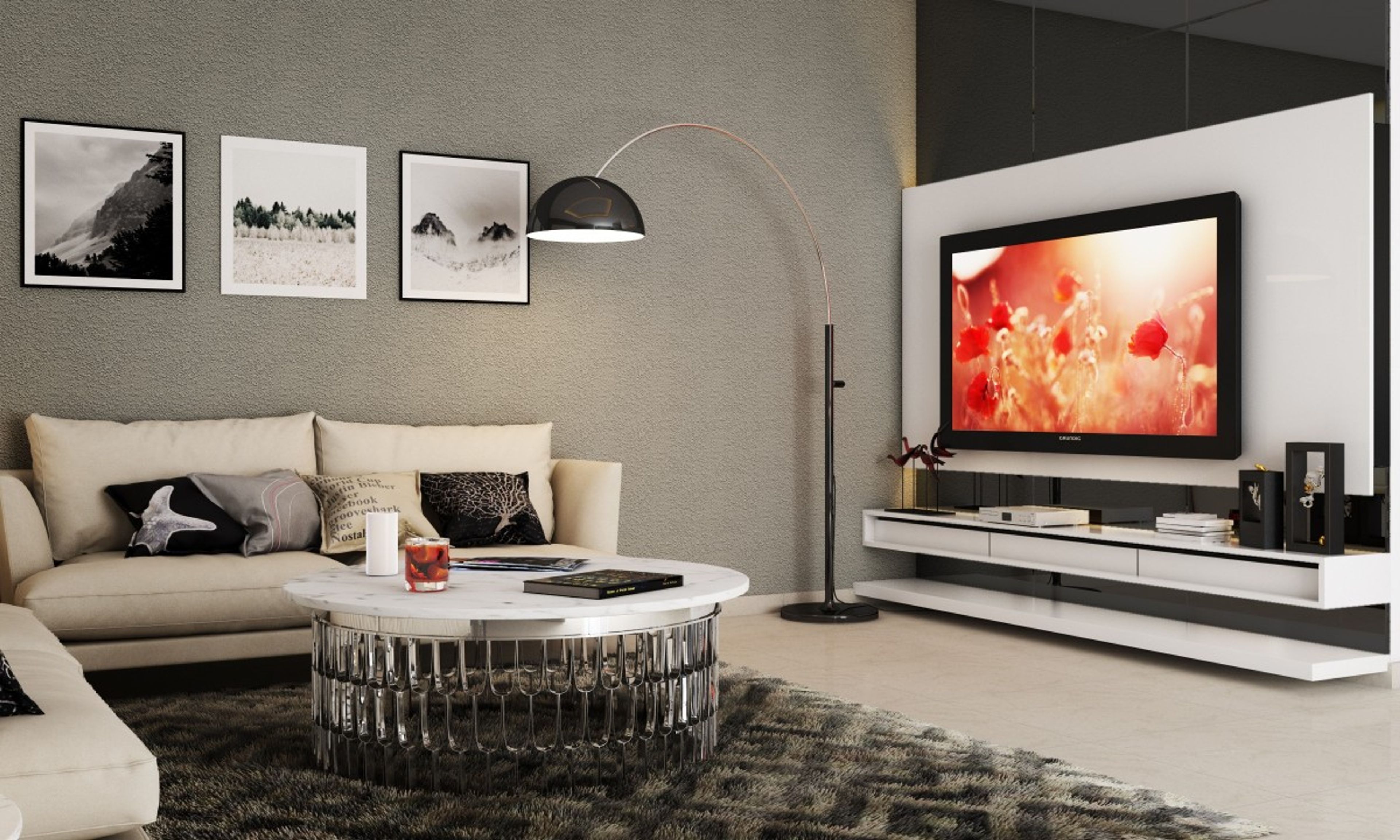 This well designed contemporary living room boasts fresh, urban flavours that will leave guests admiring.   A sleek, floating TV unit and floor lamp contributes to the upscale look. With a wide table top and a unique glass base, the coffee table steals the show.