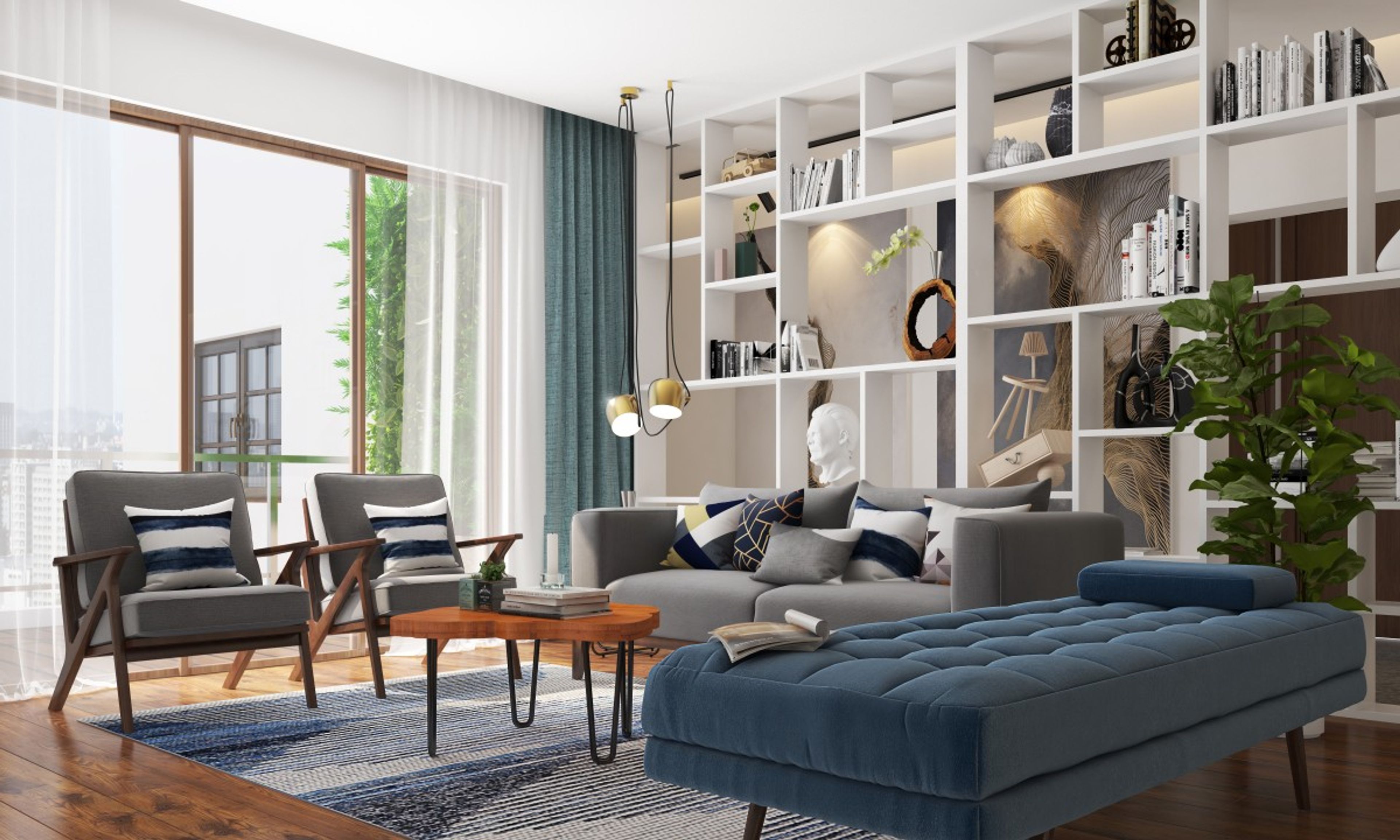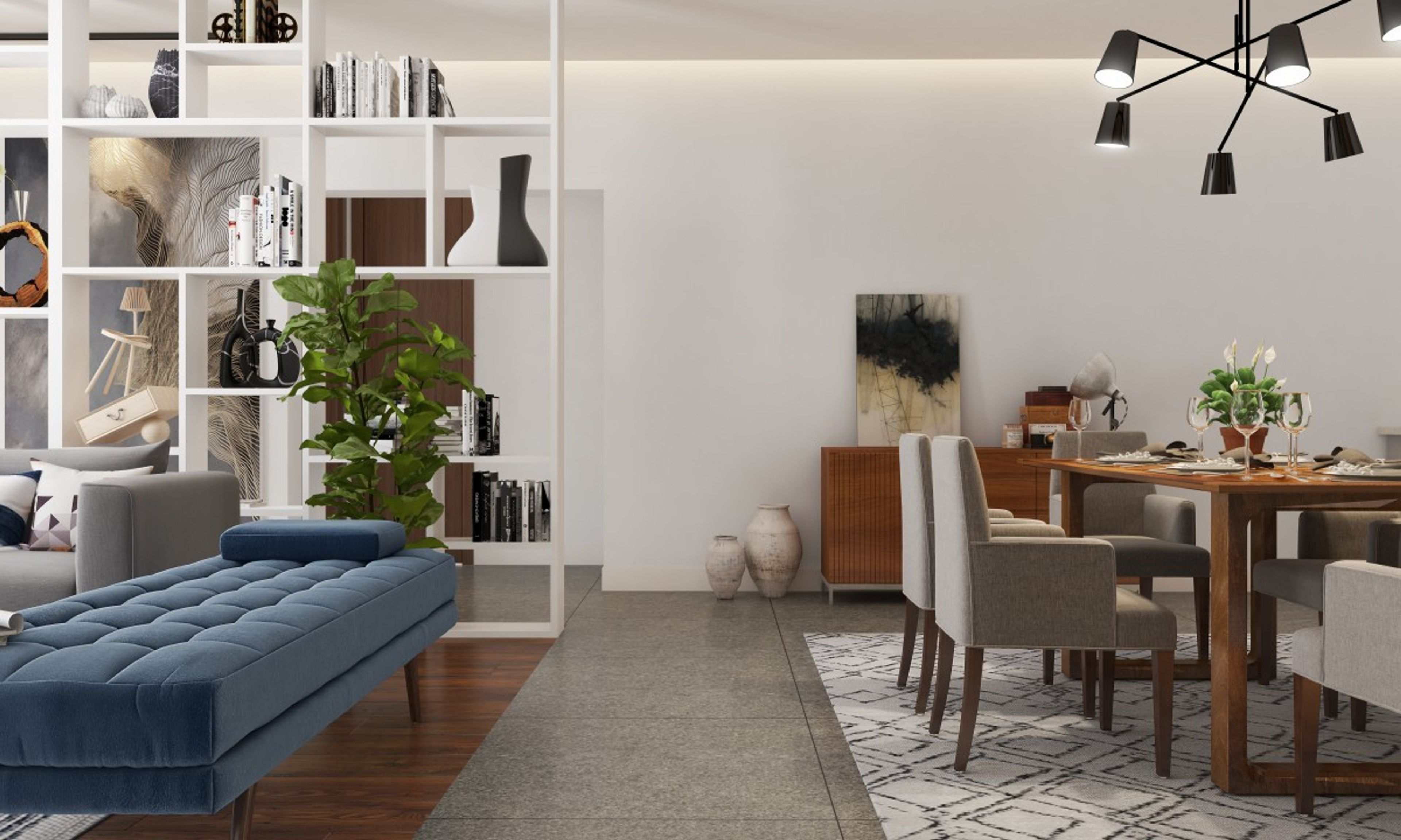 The ceiling-to-floor partition creates a clever backdrop to the soft ash grey and navy tones in this minimalist seating area, while doubling up as a brilliant, contemporary bookshelf.     The Elise sofa and Zuri diwan encourage a stylish yet easy-going vibe with artsy decor elements introducing visual intrigue.