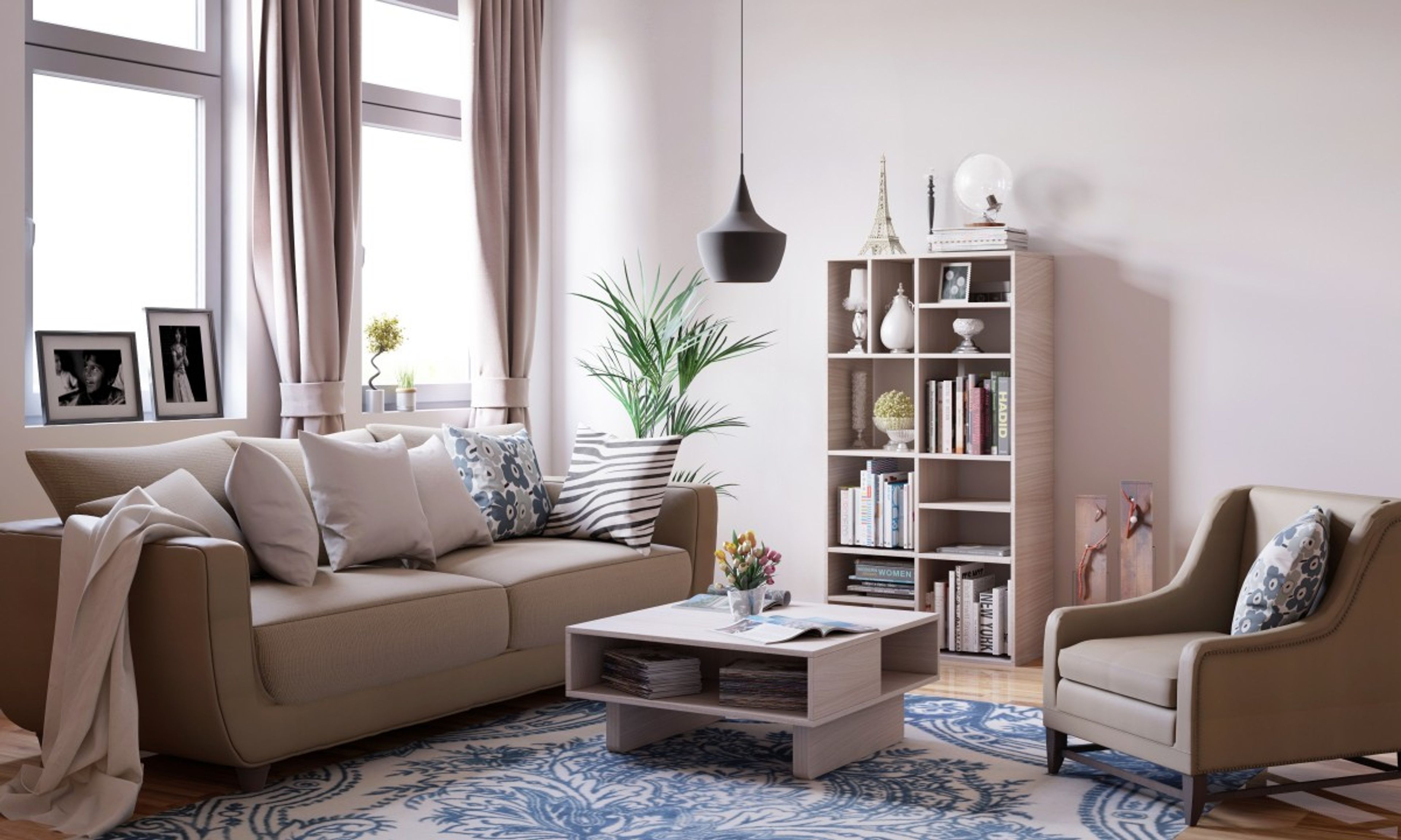 Unfurl in the enchantingly sophisticated veneer that this breath-taking living room design exudes. Sticking to the nude tones, the design of this space includes furniture pieces like Wetson 3 Seater Sofa that spellbinds everyone with its looks. The Kingscross centre table occupies the center of the room and emulates to provide adequate company to the sofa. A Hawkesbury tall bookshelf works wonders for the book hoarder in you. The savannah ceiling lamp is a statement piece that takes the design approach of the room to newer heights of elegance altogether.