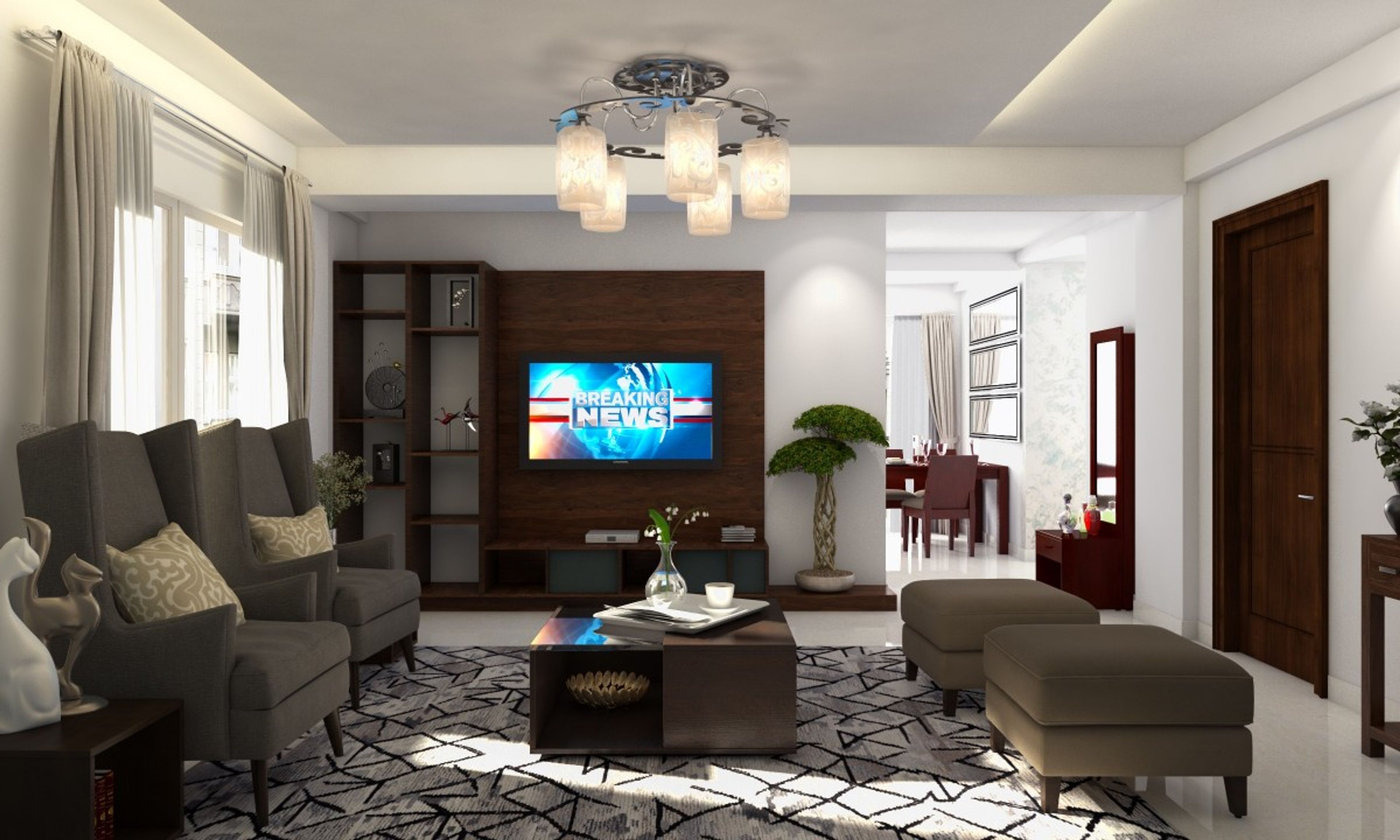 A tribal rug amps up the energy of this neutral-hued living room, with its edges punctuated by a pair of handsome Claire wingback chairs and plush Hayden ottomans.   The media centre placed at a comfortable distance helps turn this into an informal space where family and friends can unwind, while the statement chandelier balances out the drama on the floor.