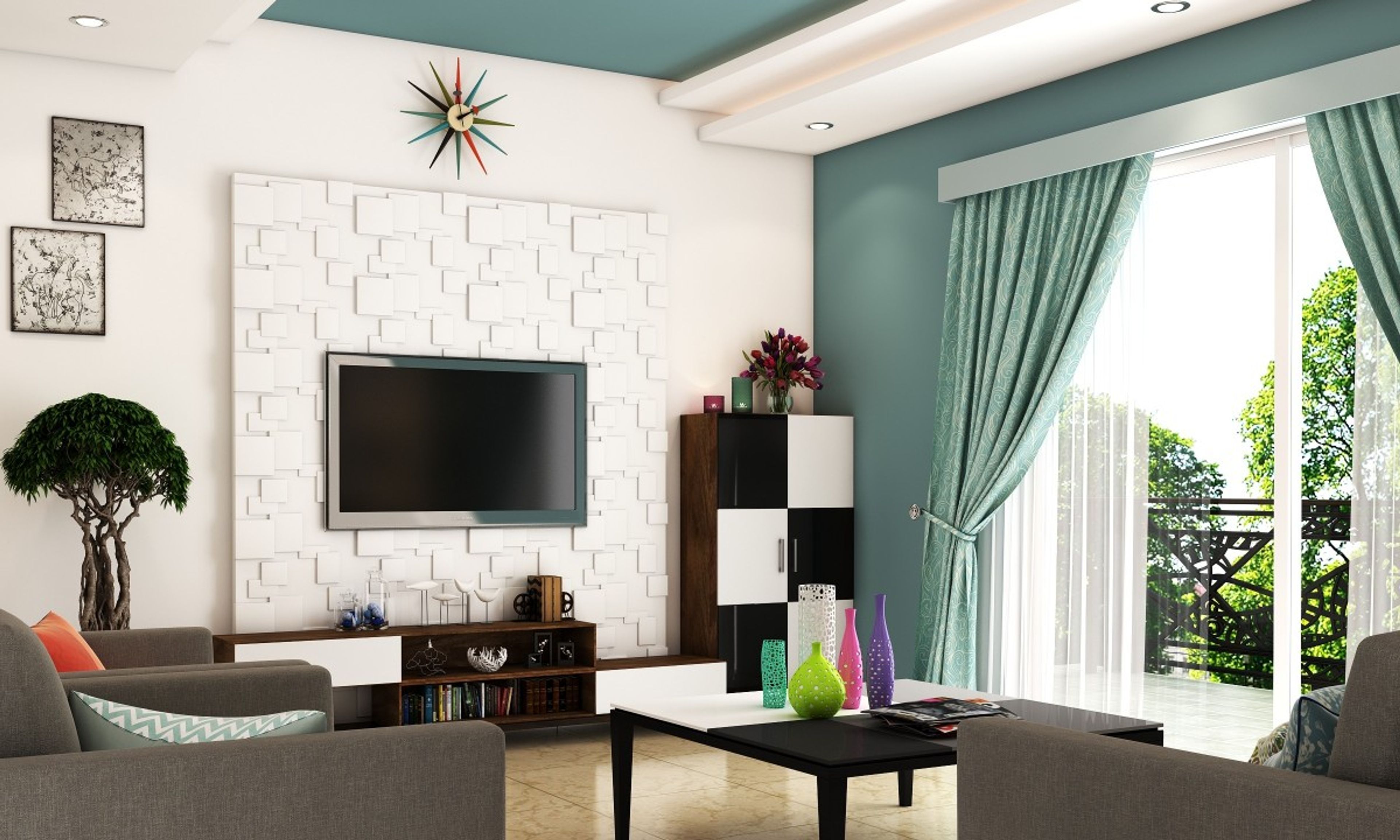A simple two-toned palette, chequered furniture and a textured wall that embraces geometry combine to bring forward the panache of a modern-day living room. The grey Oliver sofas and the Terttu coffee table with its fashionable interchangeable segments, further accentuate the no-frills, streamlined approach. Colorful accent pieces like the vase collection and wall clock act as focal points in this breezy, tranquil space.
