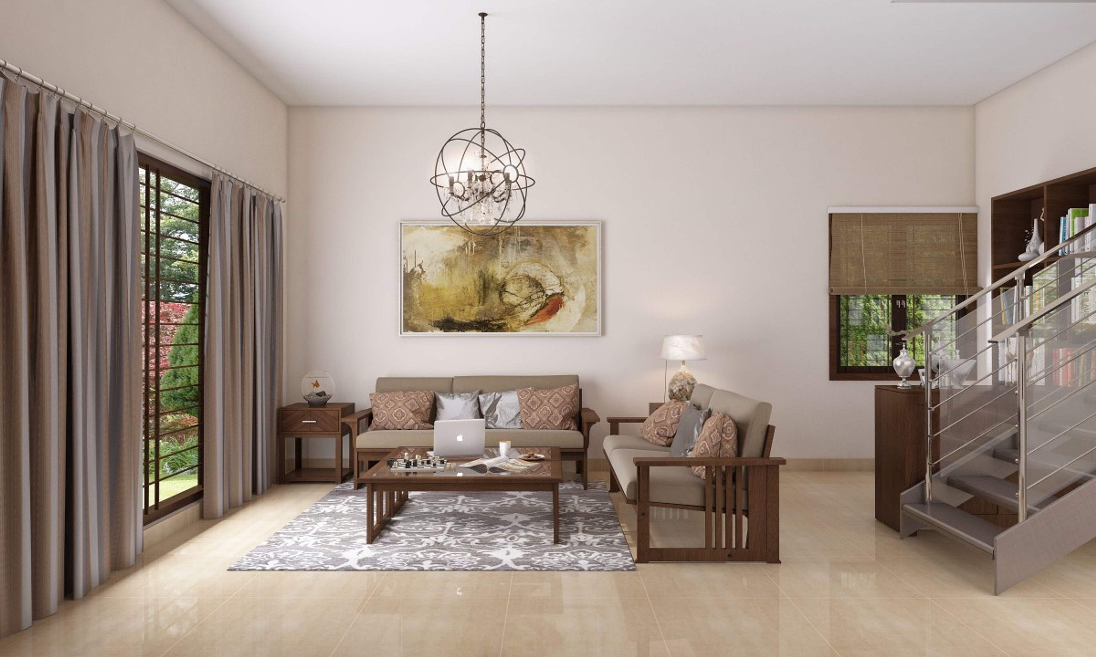 Varying shades of brown and plenty of outdoor light work together to create a calming, down-to-earth vibe in this living room. The visually light frames of the Carlton sofas and center table  accentuate the area’s roomy proportions, giving it a Zen-like feel. With its futuristic design, the chandelier makes a contemporary statement while a large format painting softens the look.   . .
