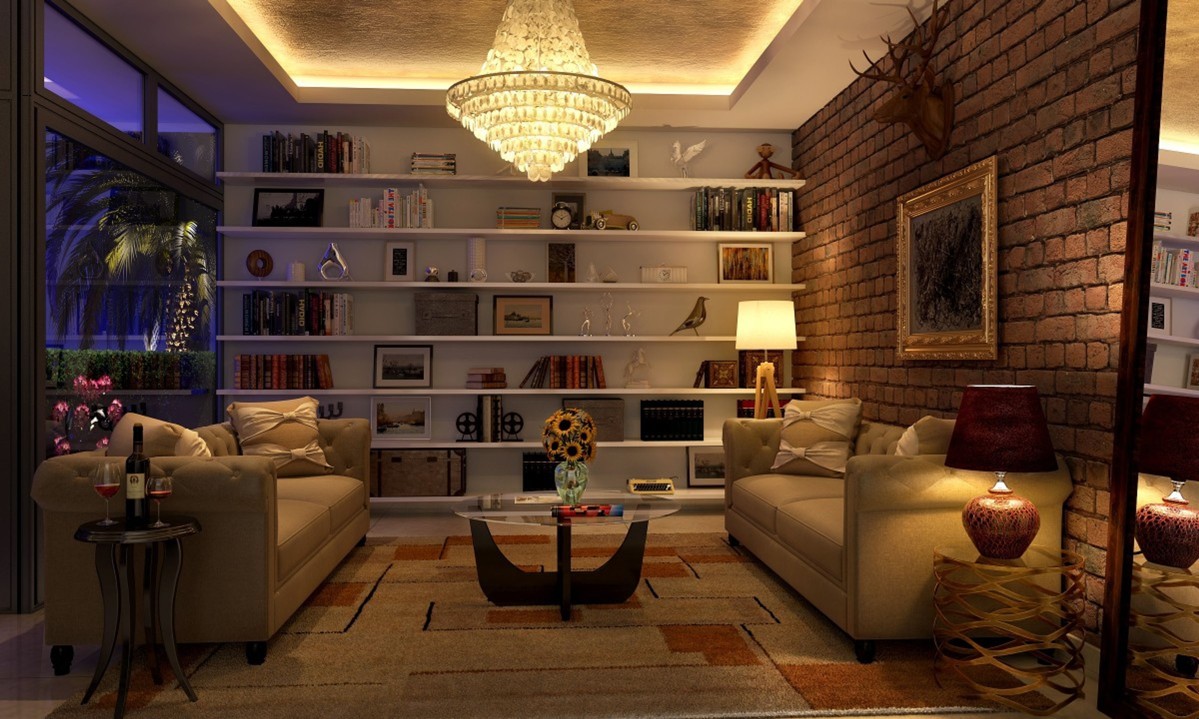 Cloaked in poise and tranquility, this exquisite transitional living room is embellished with a careful selection of ornate elements. A shimmering beaded chandelier illuminates and accentuates this gorgeous setting, perfect for entertaining friends and family.  The classy arrangement features a pair of impressive and spacious Cassandra three seater sofas with a   ritzy Augustine center table. Wall shelves display books, collectibles, and other conversation pieces.