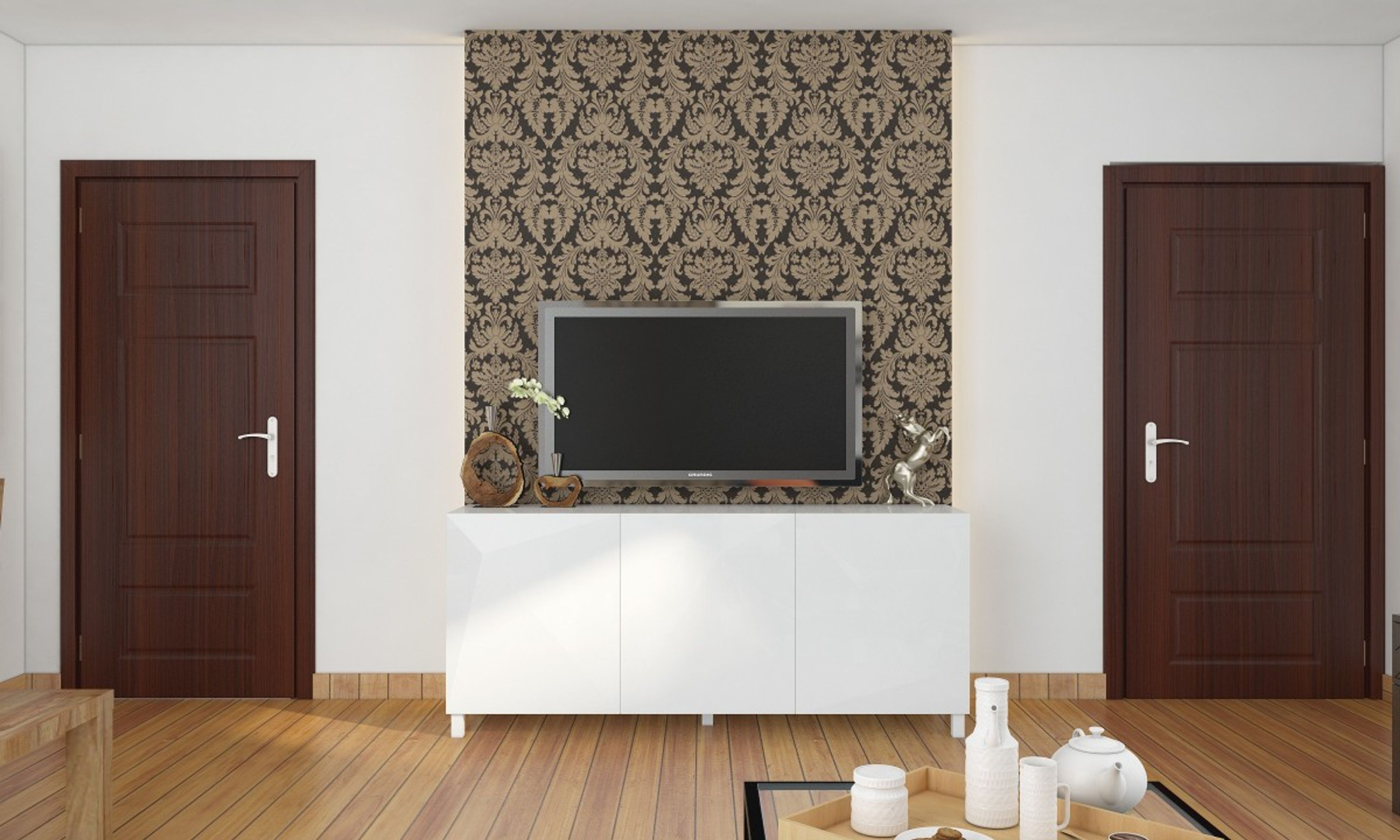 An impressive wall panel behind the TV features classic motifs that work effortlessly in this transitional styled foyer or living room arrangement. Adorned with diverse accent pieces, the Sloane sideboard adds a futuristic dimension while keeping the look elegant. Wood paneled flooring brings warmth to the overall setup.   . .
