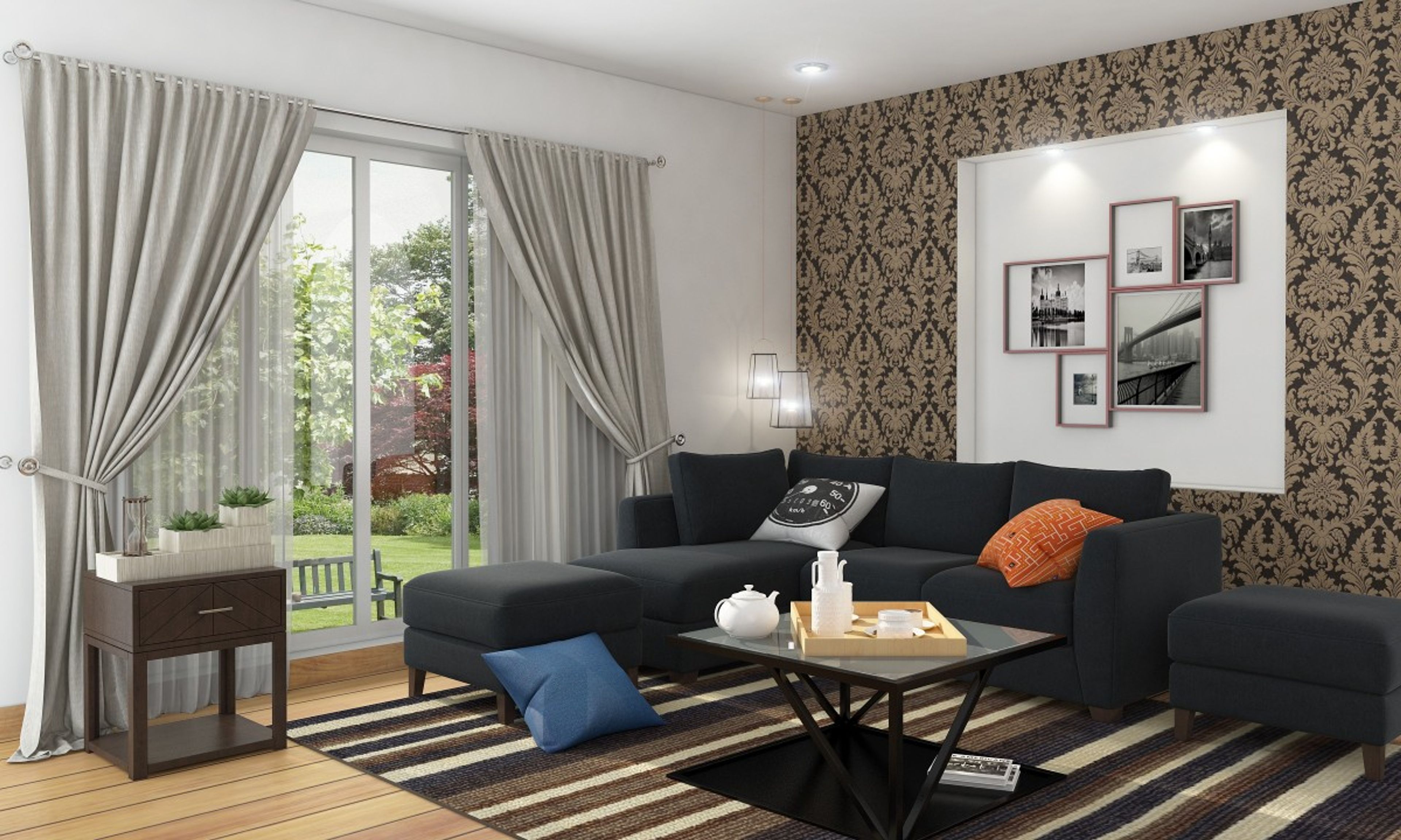 A mix of bold motifs, prints and stripes provide textural relief and character to this exquisite living room. The L-shaped Oliver sofa sits neatly with the twin Hayden ottomans along one side, leaving enough room to move around comfortably. The rug grounds the space, and we love how it doesn’t clash with the panelling of the wood floor. The simple and sturdy design of the Almast and Takara tables works in harmony with the seating area.