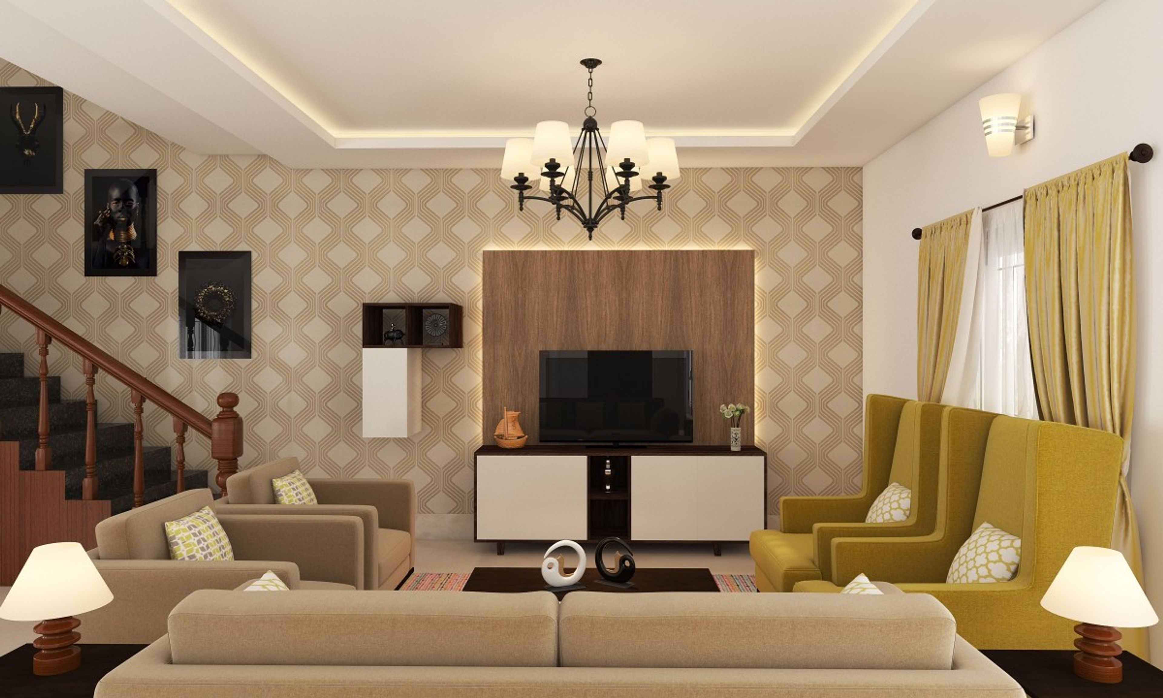 Creamy beiges and browns along with clean, contemporary pieces take the lead in this sophisticated living area.   Claire wing chairs in pops of mustard yellow stand tall amongst a neutral Ashby set. The Gyasi side table and Arcadia coffee table integrate seamlessly with this mature ambience.