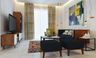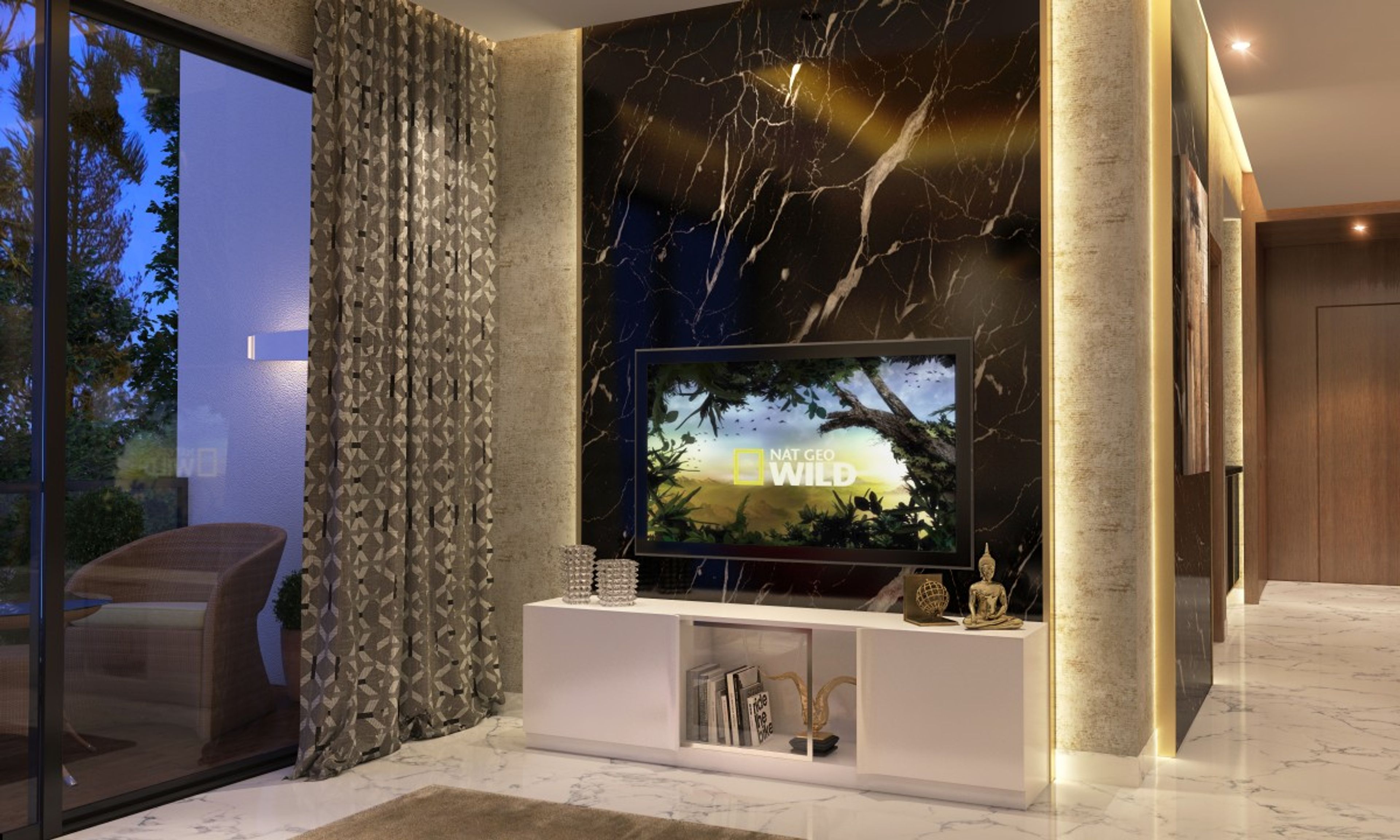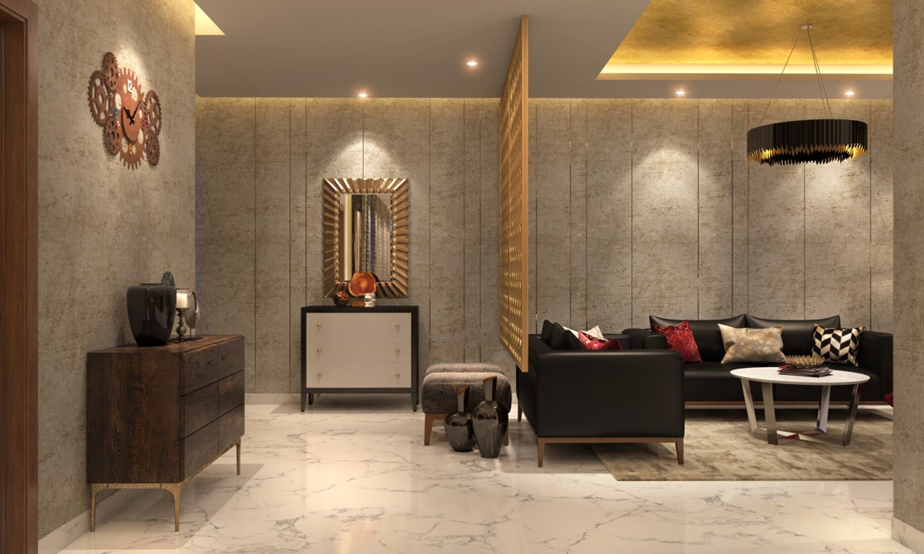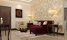 This drawing room becomes the ultimate corner for relaxation with its roomy Elise sofas and a lounge chair that comes with a leg rest.   With a mix of black, gold and ruby, this space exudes plush exuberance.   Includes furniture, accessories, and soft furnishings, all subject to availability