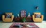 Sit down and soak up the enthralling beauty of Indian themed interiors with this stunning hallway arrangement suffused in maroon. Place decor accents on the Tarakshya console, styled in a no frills, rustic manner to balance out the richness of the maroon. A pair of spindle legged Catalonia ottomans upholstered in ochre contrast beautifully with the color scheme. A strip of Warli art adds definition to the wall and lends a ceremonial touch. Low hanging brass bells and ethnic motifs enliven the space while warm lighting creates a spellbinding aura that keeps you riveted.