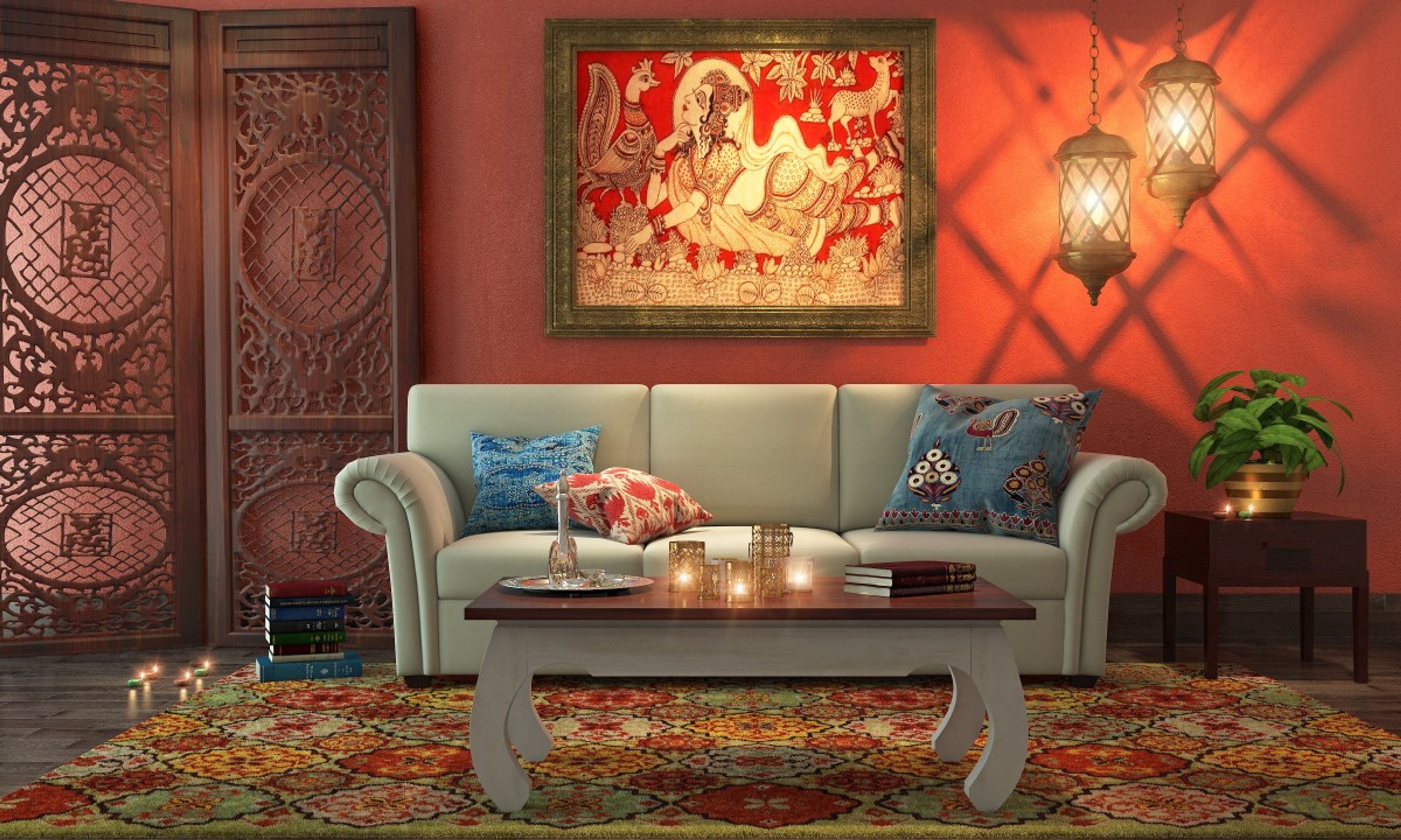 Lit up by dazzling pendant lamps, this divine look presents a beguiling combination of rustic, ethnic and contemporary elements. A traditional Indian painting and an intricately carved screen create a stunning backdrop for the furniture. The careful placement of decor elements draws your gaze to the centerpiece - a Pristine white Marion sofa 3 seater sofa with elegant rolled arms. Paired off in the foreground is the distinctive Shyla table, placed on a rainbow-hued Melinda rug. A clean lined Nelson bedside table balances out the richness of the look, giving you space to display a refreshing spot of greenery.