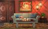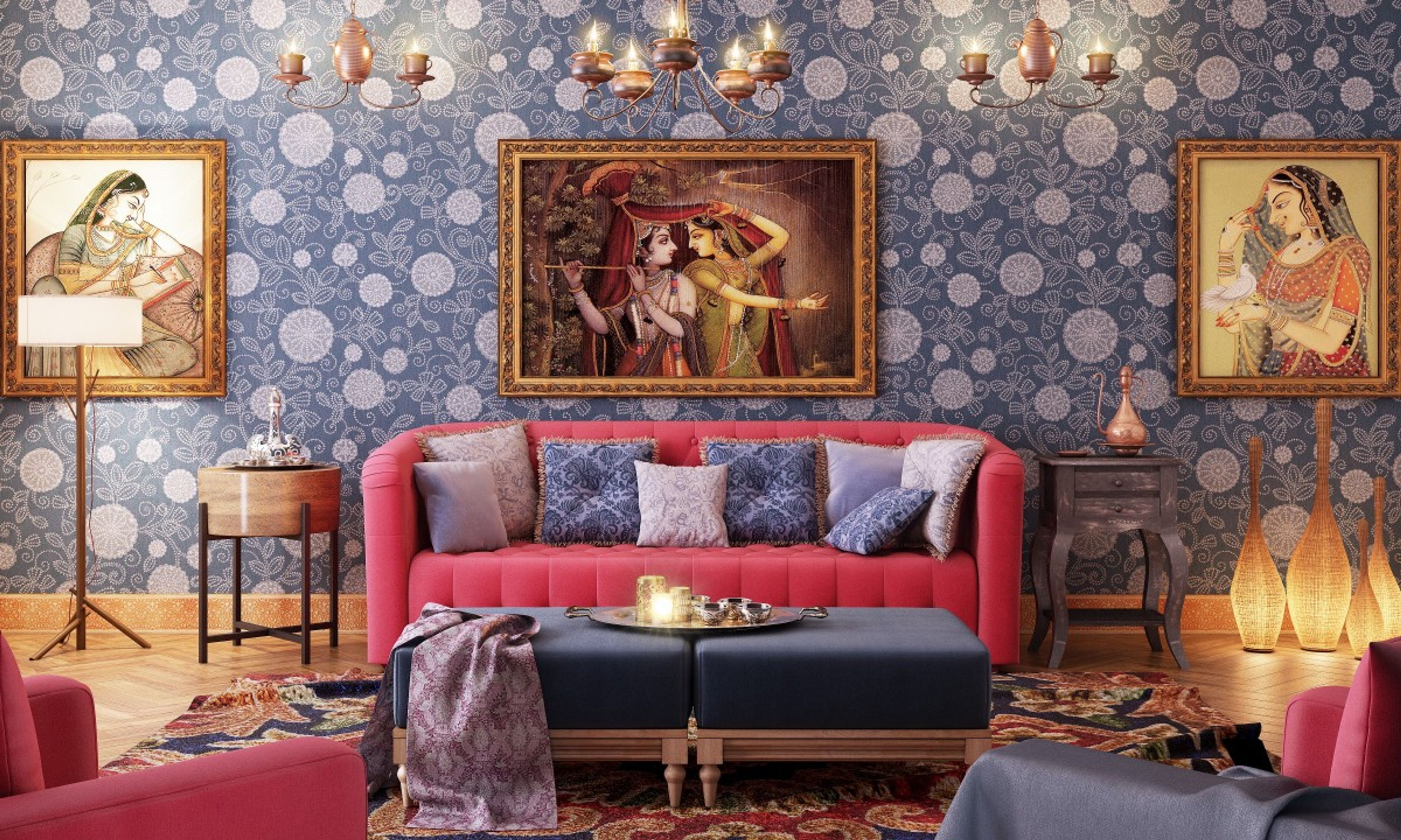 The epitome of luxuriant style, every element in this lavish living room carries a distinctive charm. Mesmerising indigo wallpaper featuring intricate floral patterns sets the tone for the room. The Byron tufted sofa in candy pink forms an appealing focal point, flanked by the elegantly flared Swara bedside table  and the rustic Yahvi coffee table on either side. Blue-grey Catalonia ottomans placed in front  add to the comfort and can also double up as a makeshift centre table. Traditional style artwork and a trio of chandeliers complete the air of regal elegance to the look.