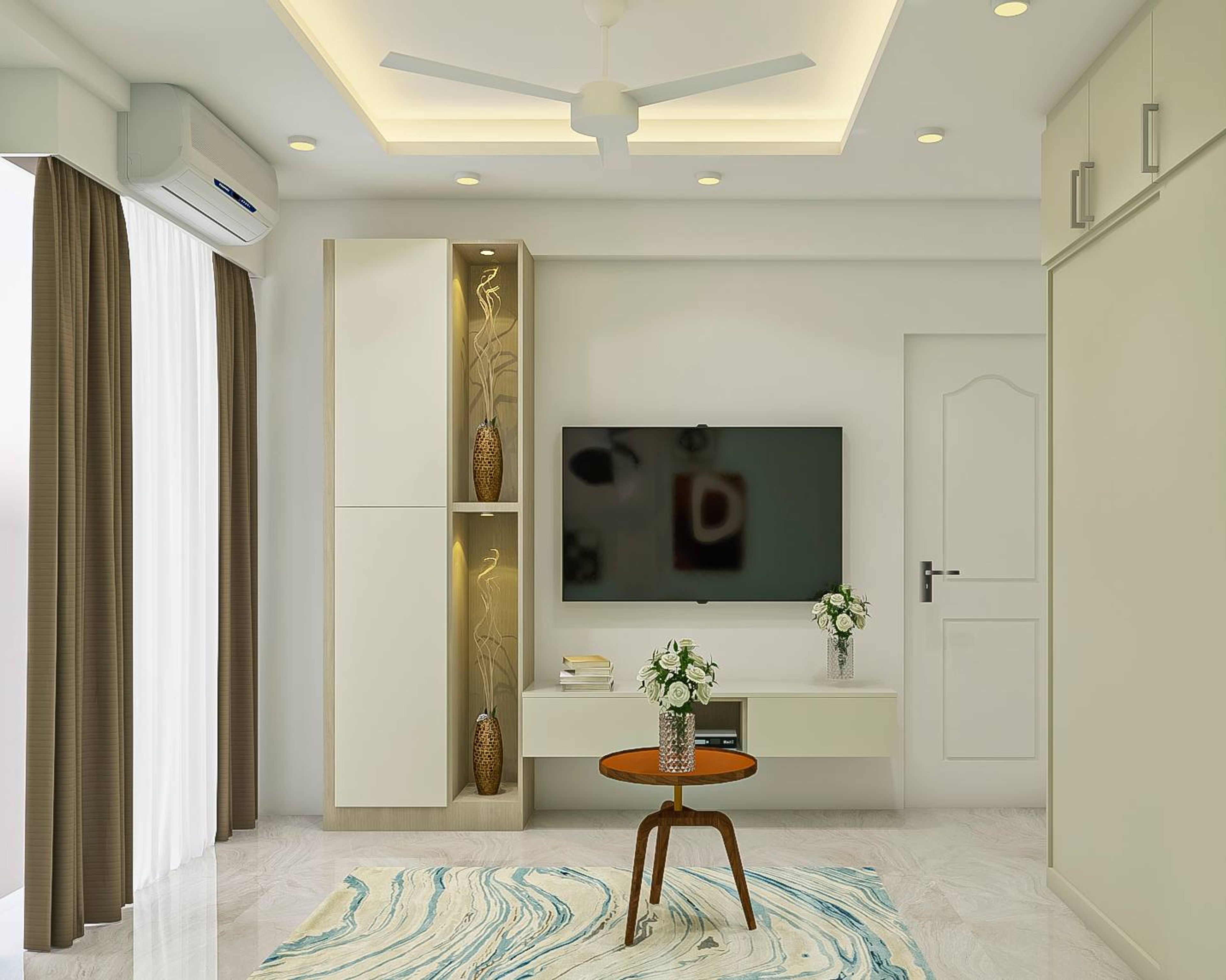 A stunning combination of blue and cream is noticed in this living room design. The L-shaped sofa looks good while offering a comfortable seating experience. This room is perfect for a rental or a studio apartment and comes with a large wardrobe with sliding doors and lofts. The living room design is complete with a TV unit.