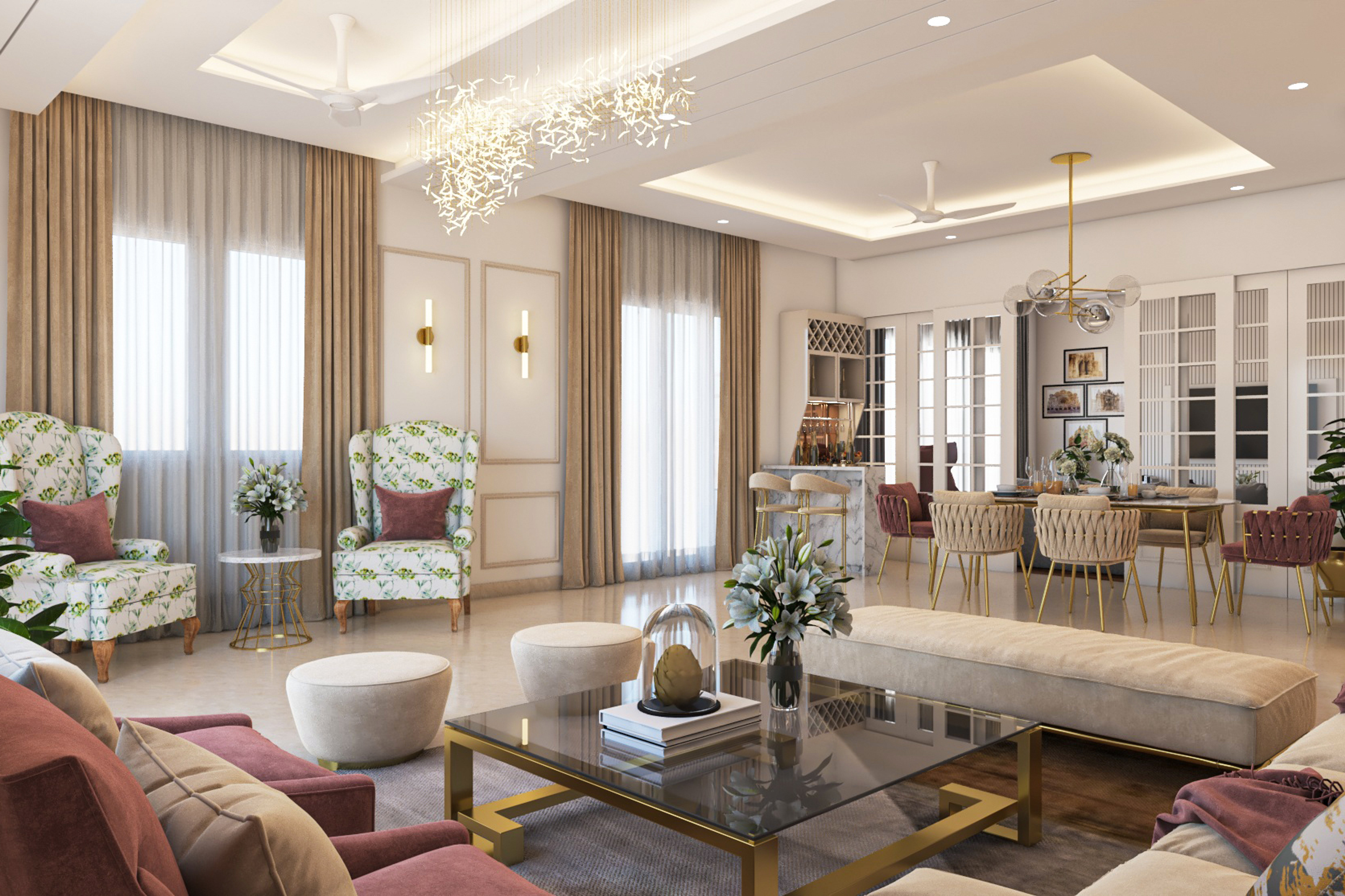 Classic Spacious Living Room Design With Beige And Pink Sofa